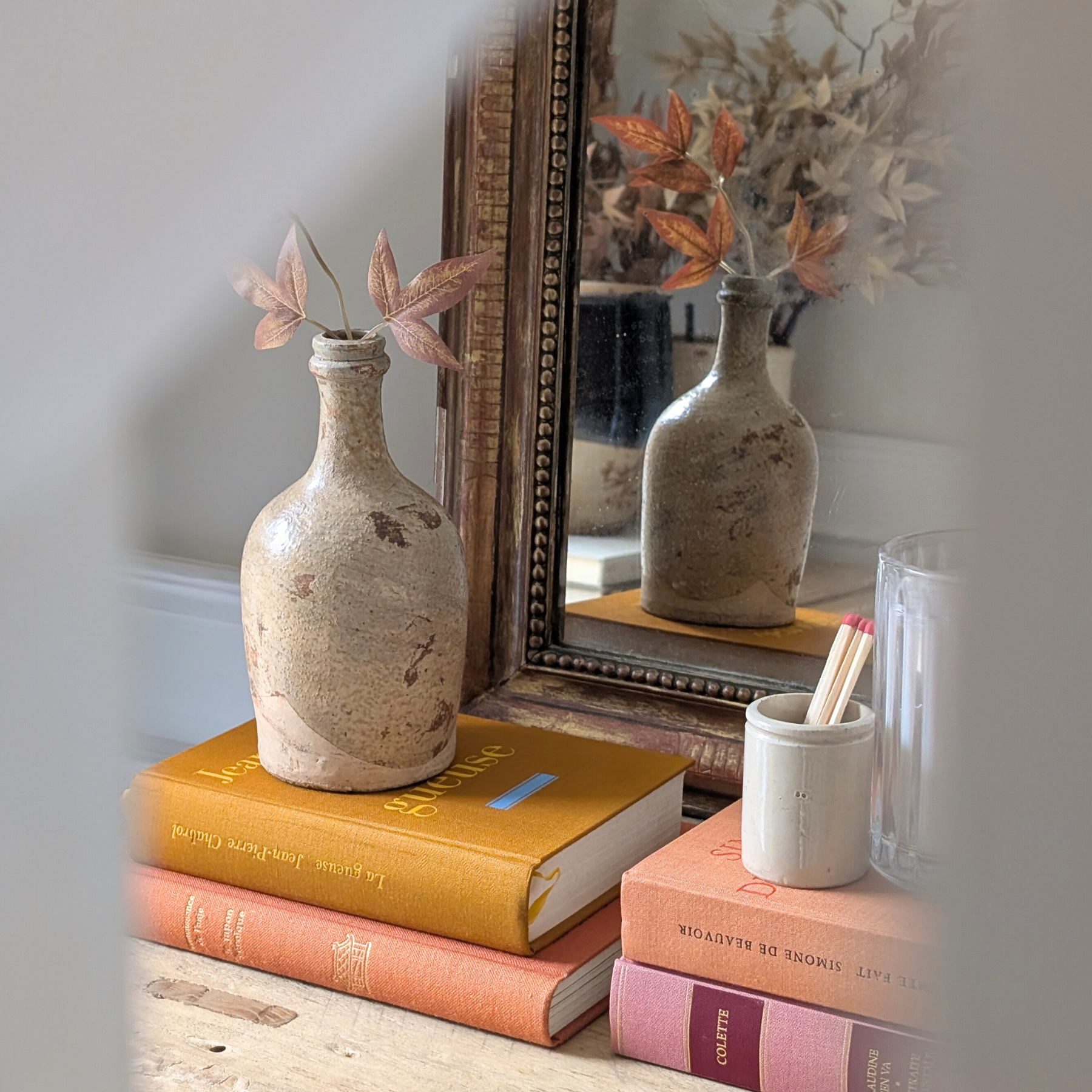 This lovely antique bottle is glazed in a beautiful pale speckled neutral hue, and is just the ideal size for styling on a windowsill or shelf with a single stem!