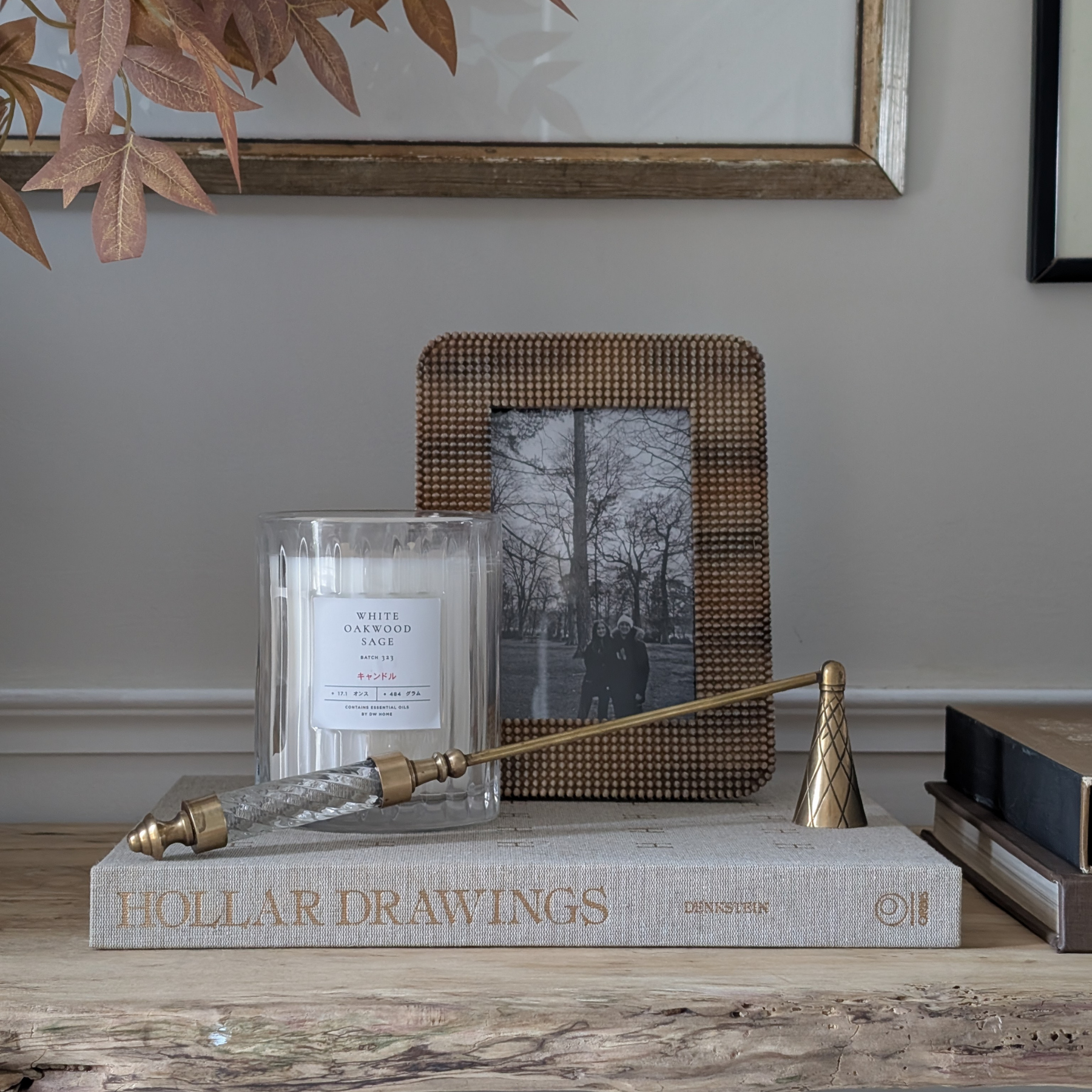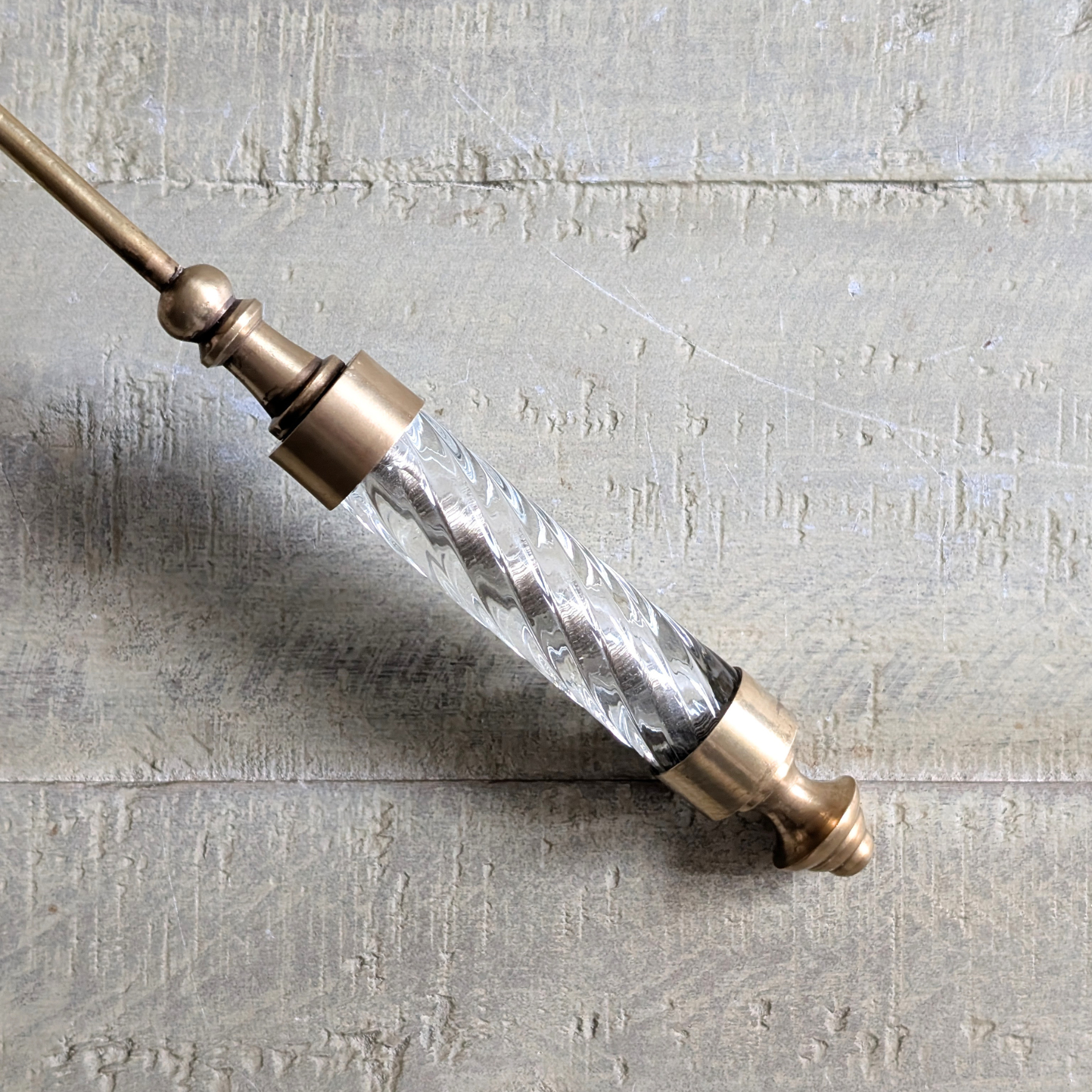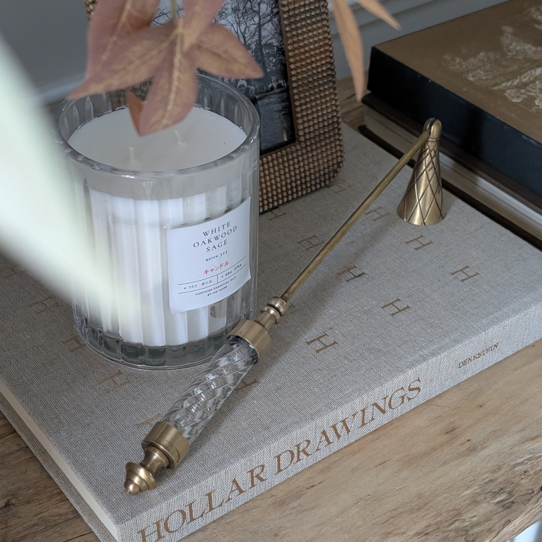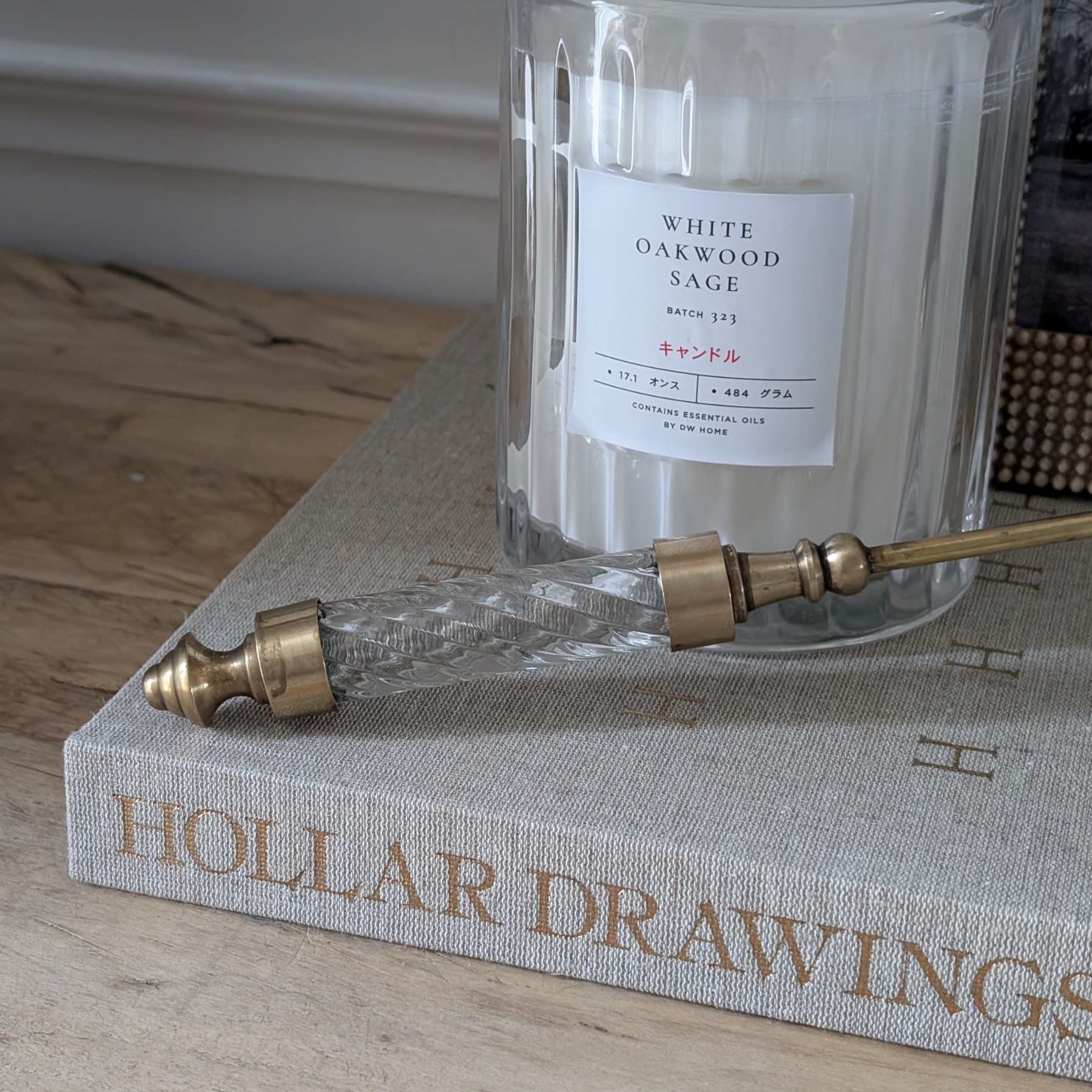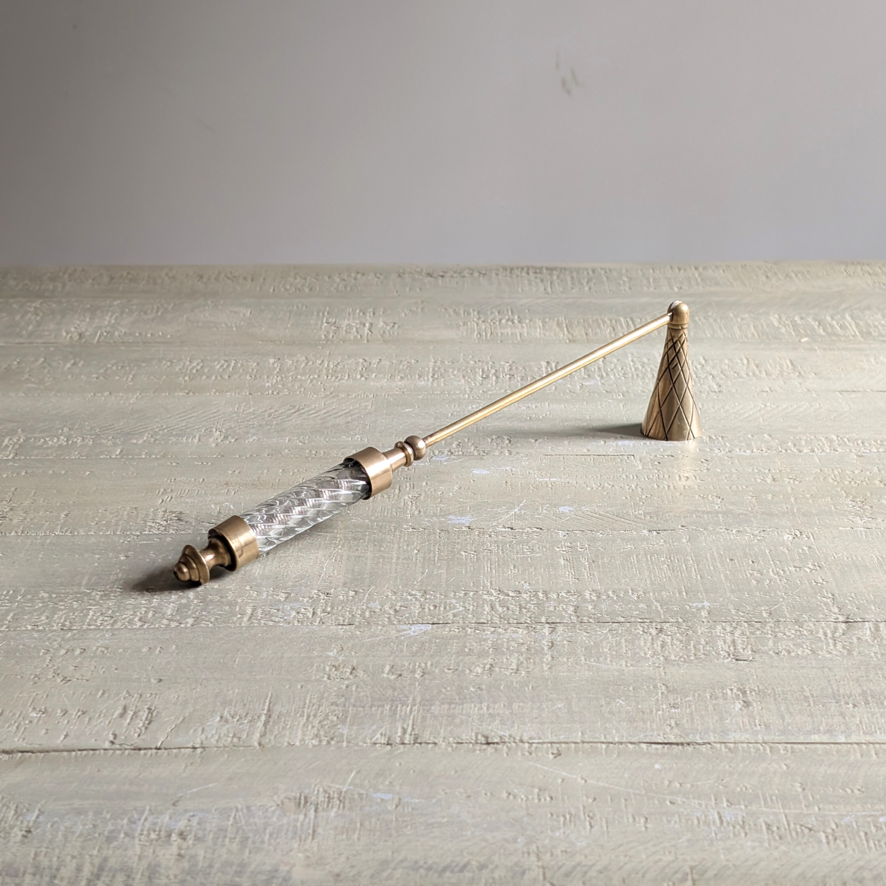 This stunning Art Deco brass candle snuffer is truly one-of-a-kind. With an etched top and spiralling crystal bottom, this intricately made snuffer was made to be displayed. An ideal pairing with your favourite Christmas candle.