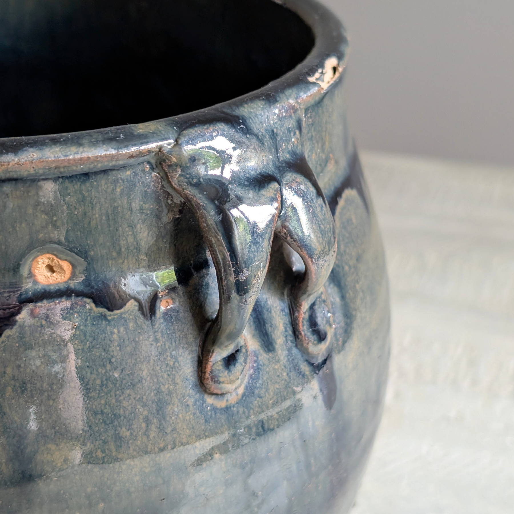 Thought to date back to the late 19th century, this inky blue glazed Chinese pot was originally used to store and preserve food. A real statement piece to add depth and drama to your space, this vessel has various deep tones throughout, and two teeny ears to add to its charm. If this pot could talk, I have a feeling it'd rather some rather amazing stories to tell!