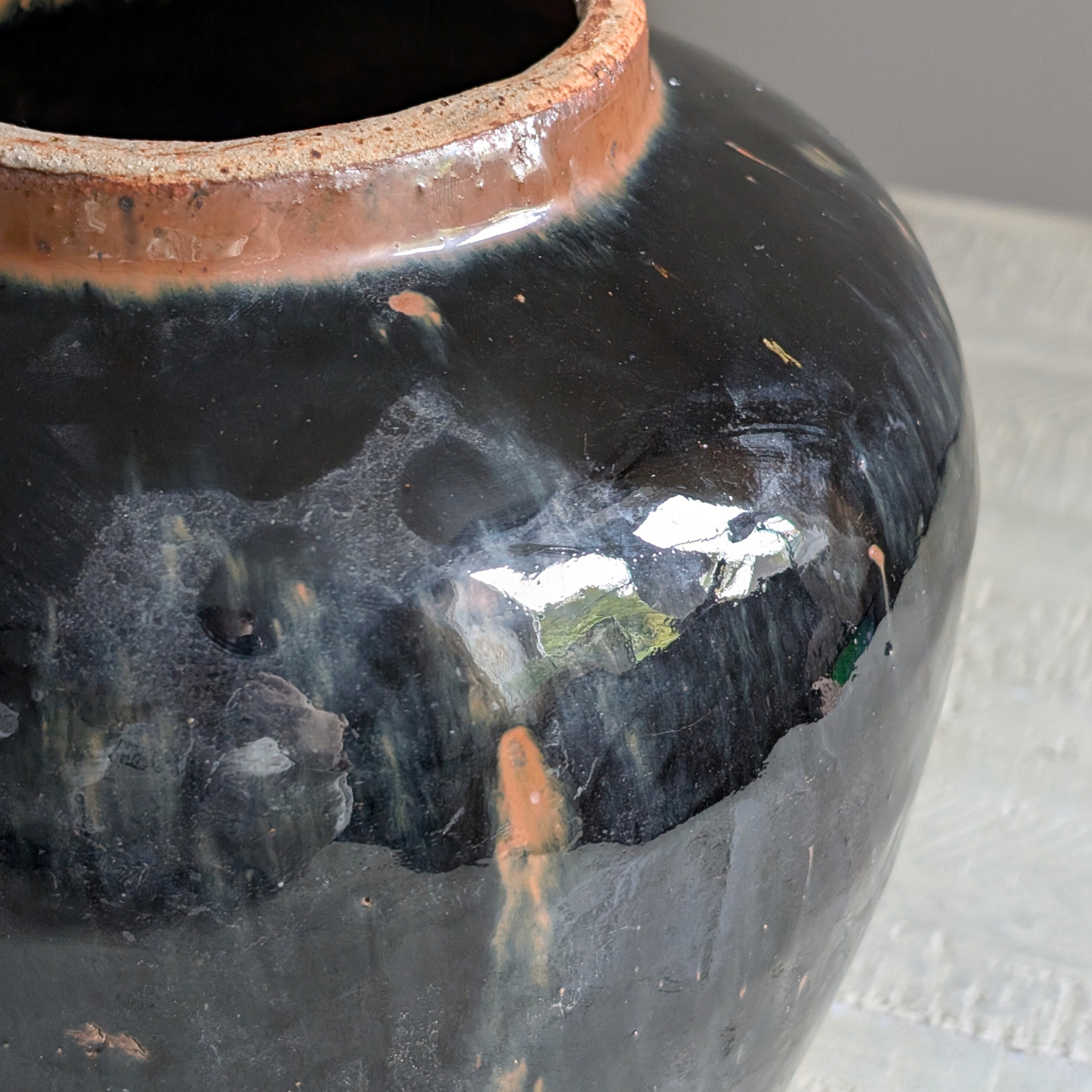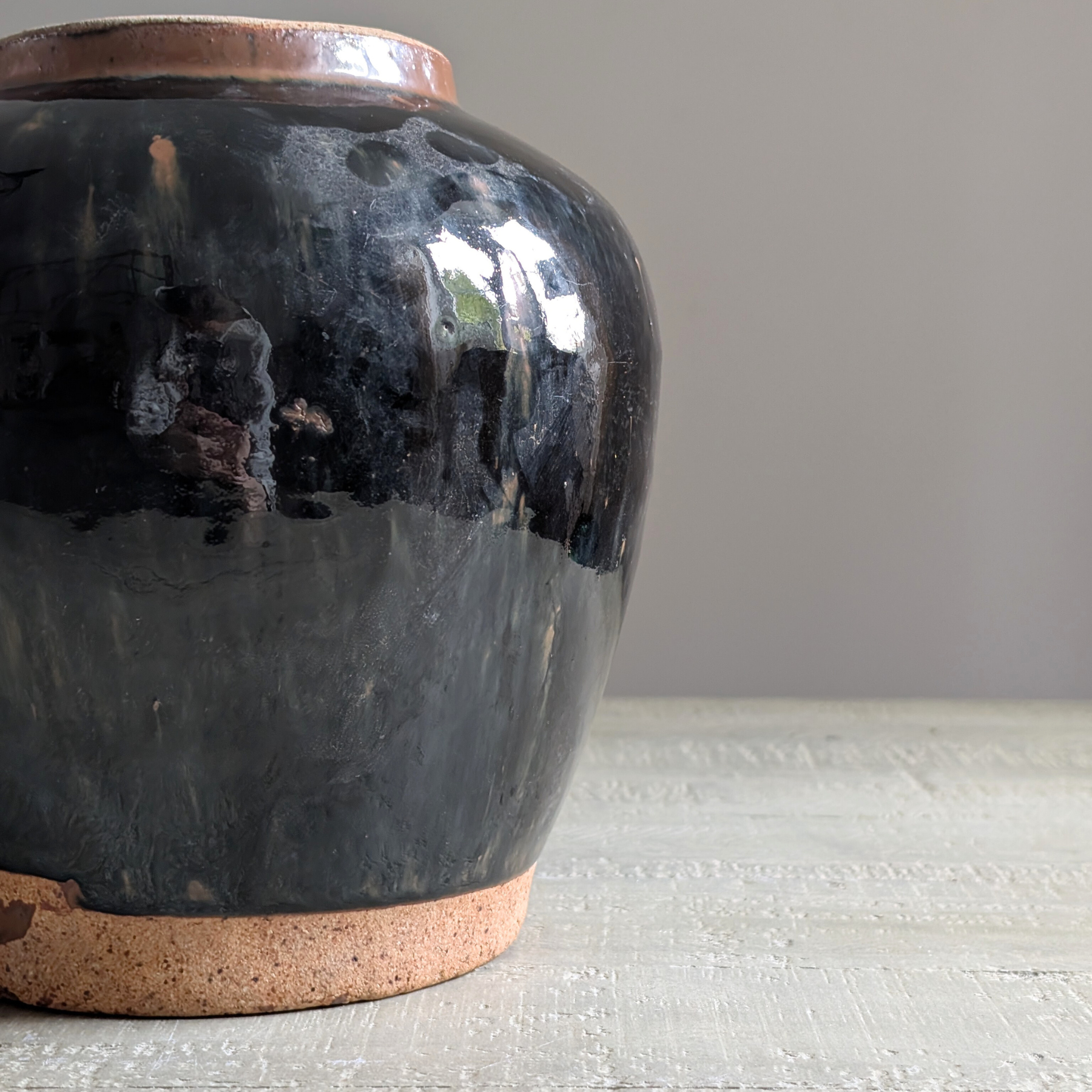 This stunning antique Chinese vessel is alllllll about depth and drama. A super shiny black glaze drips down this beautiful earthenware pot making it ideal for displaying a contrasting floral bouquet - think hydrangeas! Pop atop shelfs, a coffee table or a console for instant impact.