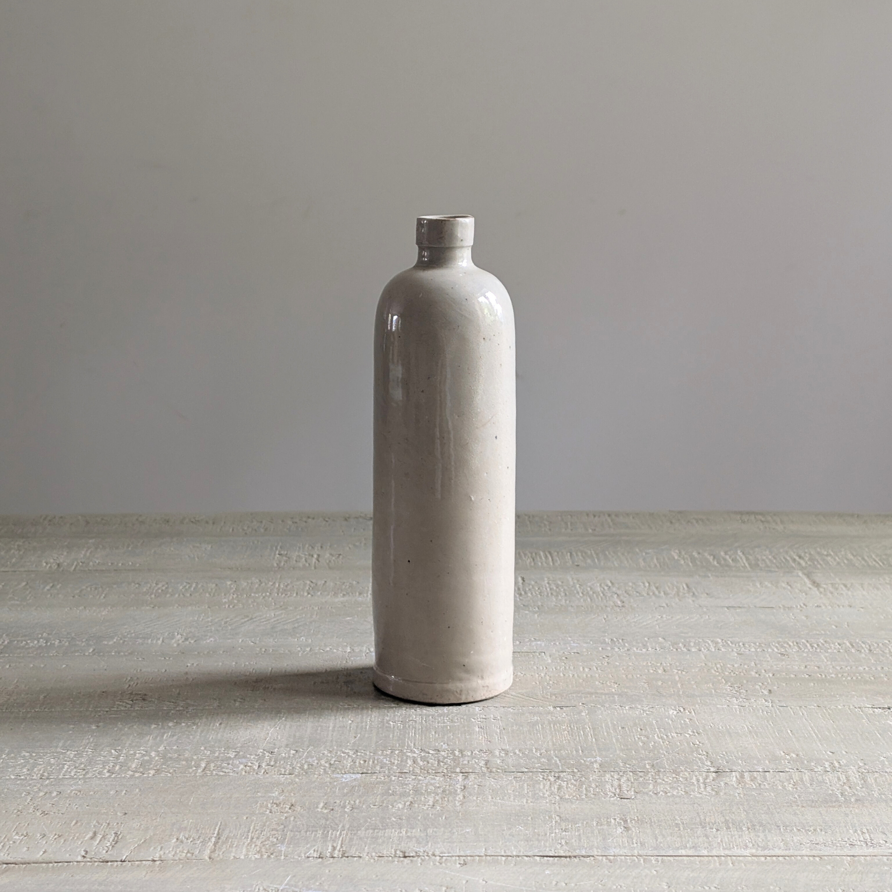 This aged bottle is glazed in a creamy, slightly speckled glaze, making it an ideal neutral styling piece for modern homes. Originally used as a liquor bottle with its sweet stamped detail on the bottom, its slim, tall silhouette makes it a perfect choice for a vase to hold a single stem.