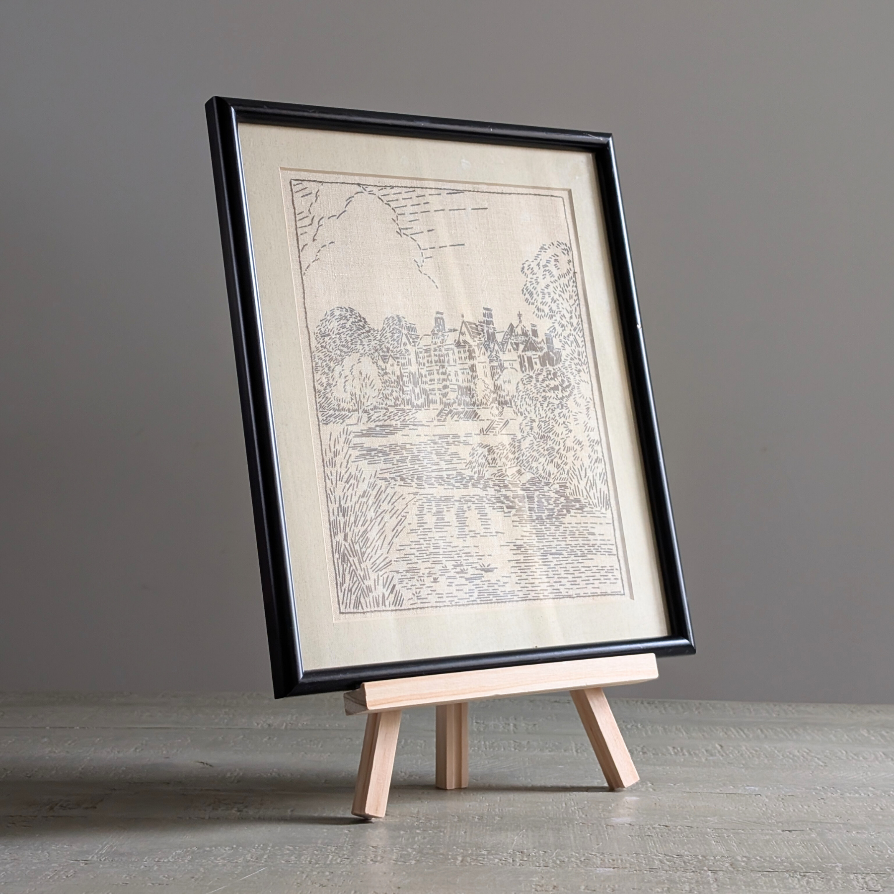 This beautiful embroidery is part of a small collection I sourced, and I just love it! A black and blue thread on a pale neutral fabric, this black framed piece depicts a still lake with a stunning house in the background. The perfect size for popping on a shelf or leaning on a table. A perfect choice for monochrome or neutral colour schemes!