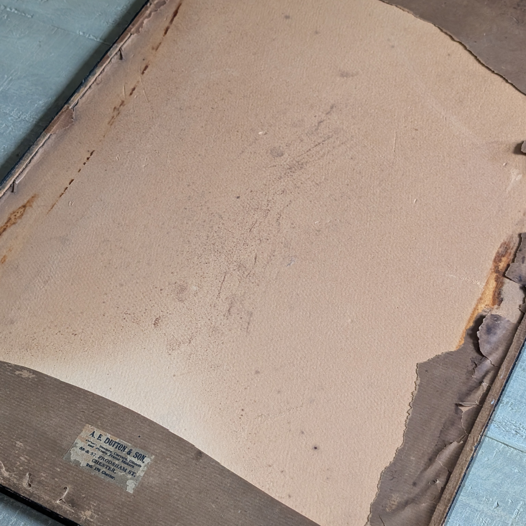 One of a pair of charcoal sketches of architectural beauties in Chester, England, this mounted and framed piece features the Bear and Billet, a Grade 1 listed timber-framed townhouse, recorded in the National Heritage List for England. A stunning large-scale frame that would work wonderfully, lent on a console, or hung on an empty piece of wall space to add drama and depth.