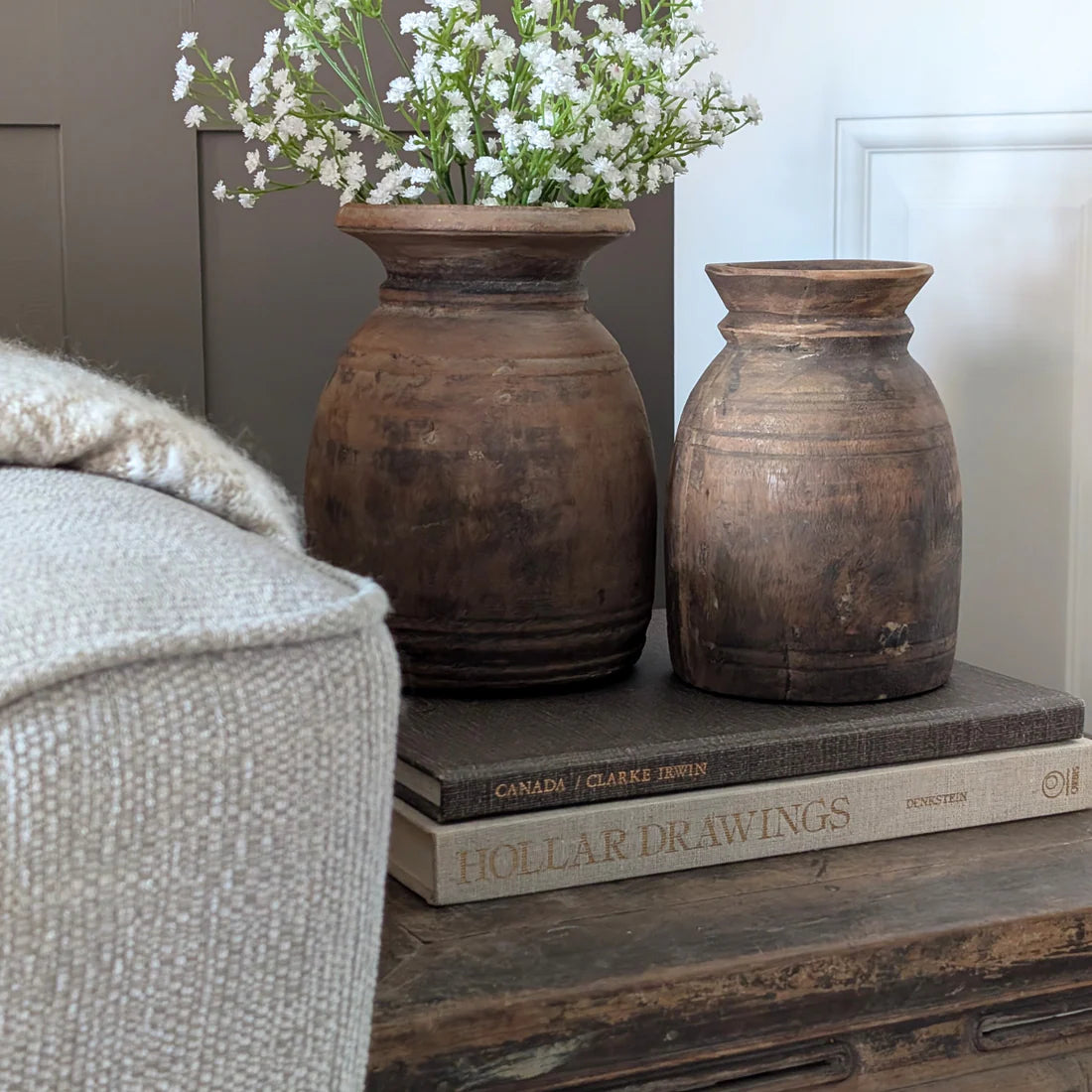 These decorative vases were once used to make curds! Crafted from wood with beautiful hand-carved details, this rustic pot is ideal for displaying dried flowers or styling on its own to add depth and texture to your space. Available in 2 sizes, these wooden vases look even better styled together for a layered look!