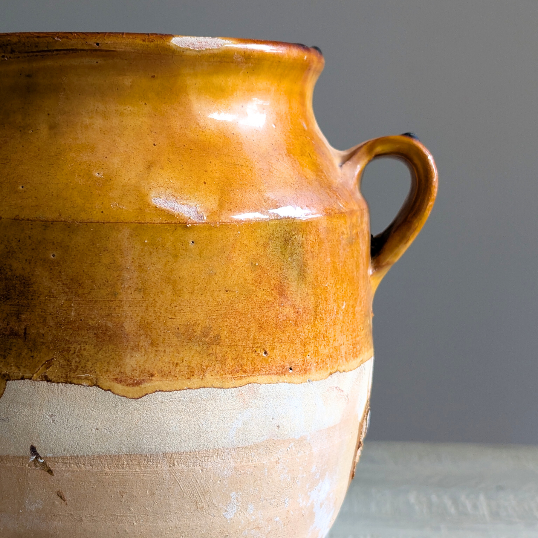 Warming, sunshine, honey yellow tones will always have my heart. This large French confit pot features a characteristic unglazed earthenware bottom and a beautiful sunshine yellow glaze to the top of the pot, with some drippy detail. Featuring delicate small handles, this is a statement piece that deserves to be displayed. Due to the age of this pot, it does feature some minor signs of wear, as shown in pictures.