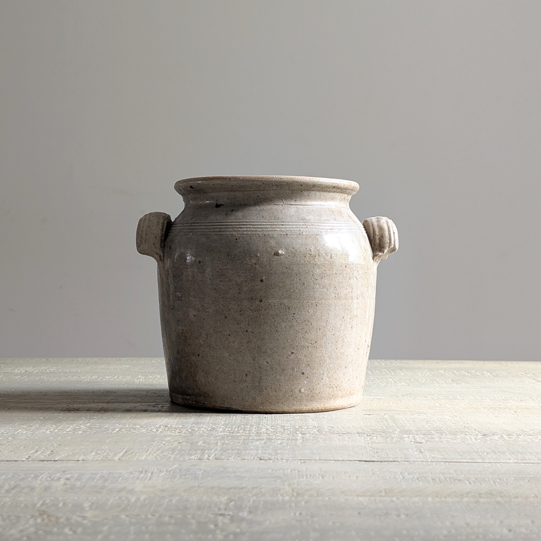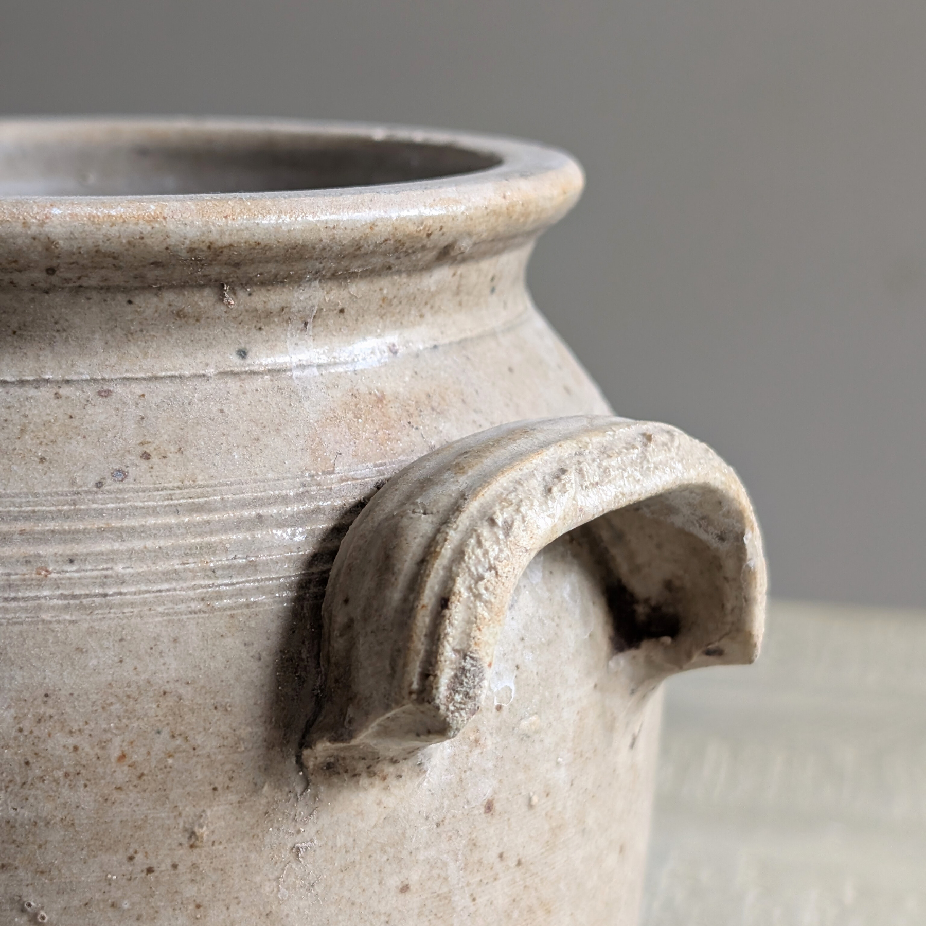 A truly timeless pot. This double-handled medium French confit pot has a beautiful, pale neutral glaze. With little 'ears', it's an ideal piece for styling in a kitchen or on living room shelves.