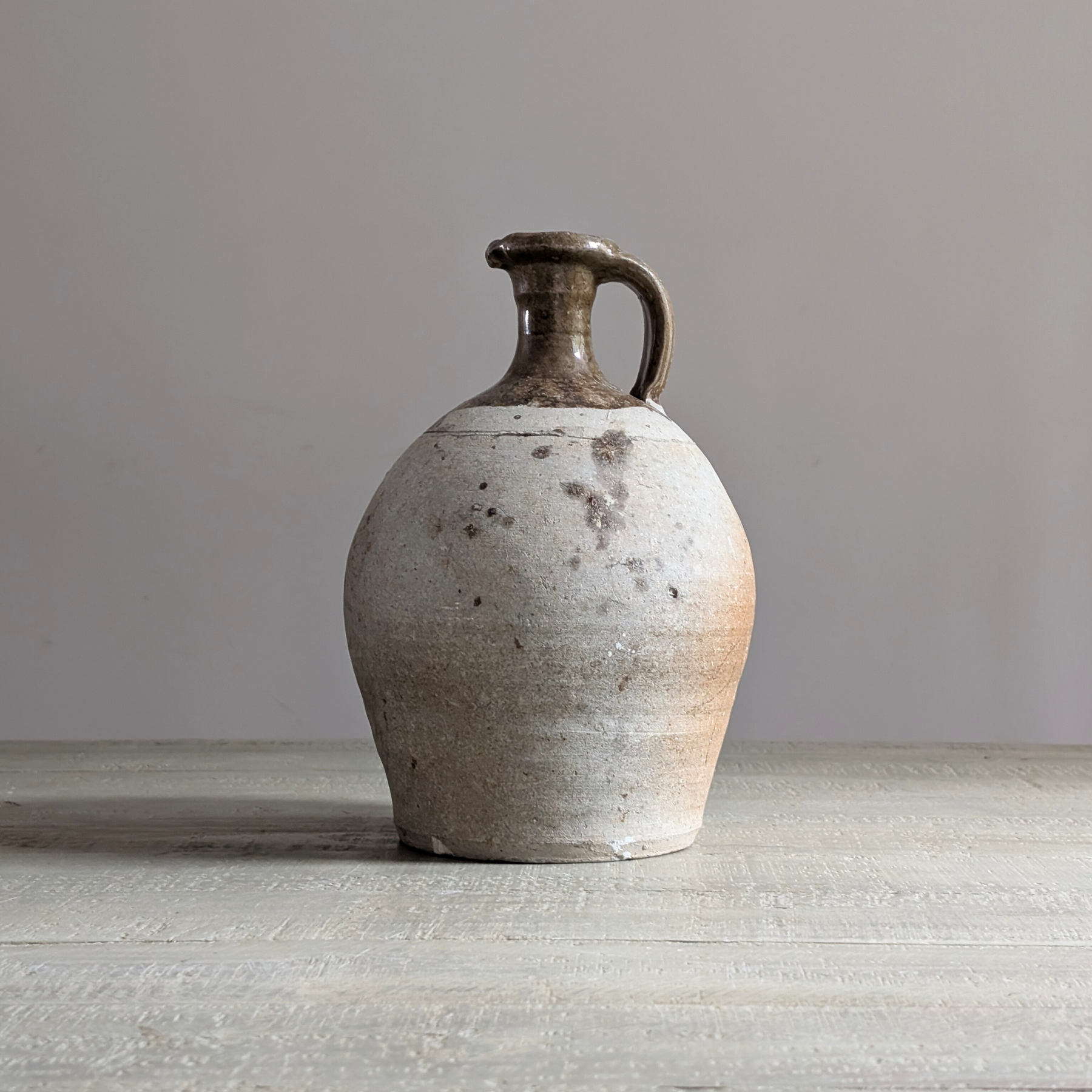 This gorgeous antique oil jug features a charming, slim neck and high handle. A beautiful matte grey and earthy-toned body with a taupe-glazed neck, this pot is a striking piece for shelf styling.