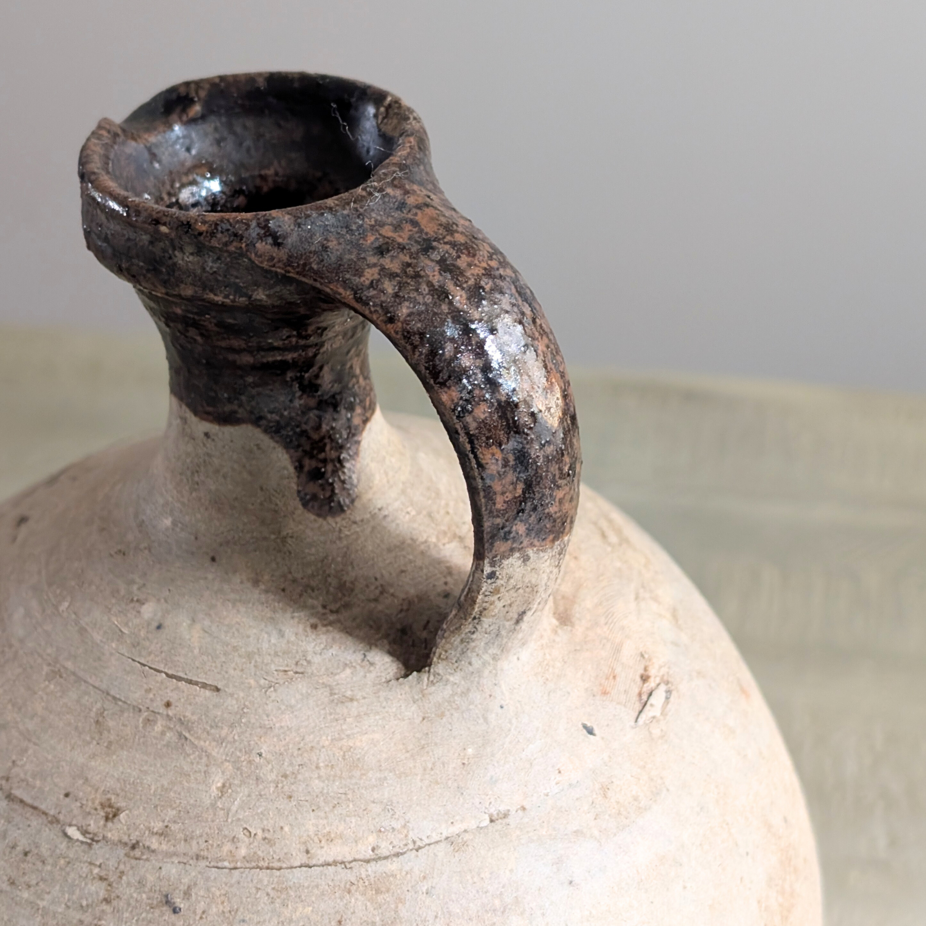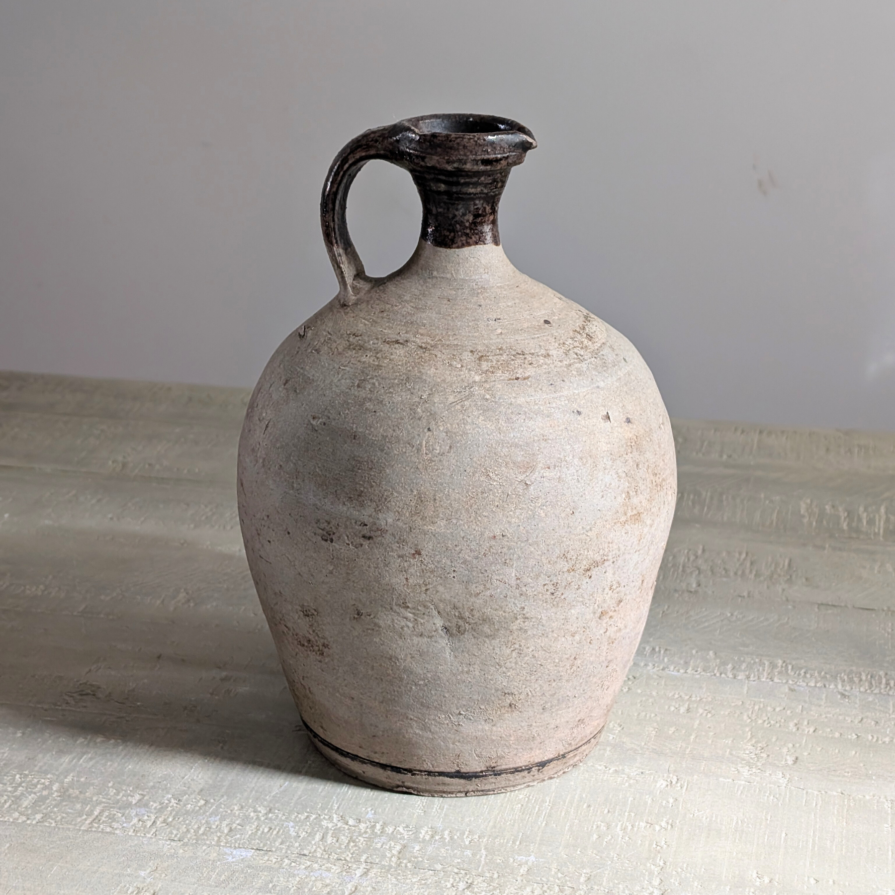 This gorgeous antique oil jug features a charming, slim neck and high handle. A beautiful matte grey body with an espresso-glazed neck, this pot is a striking piece for shelf styling.