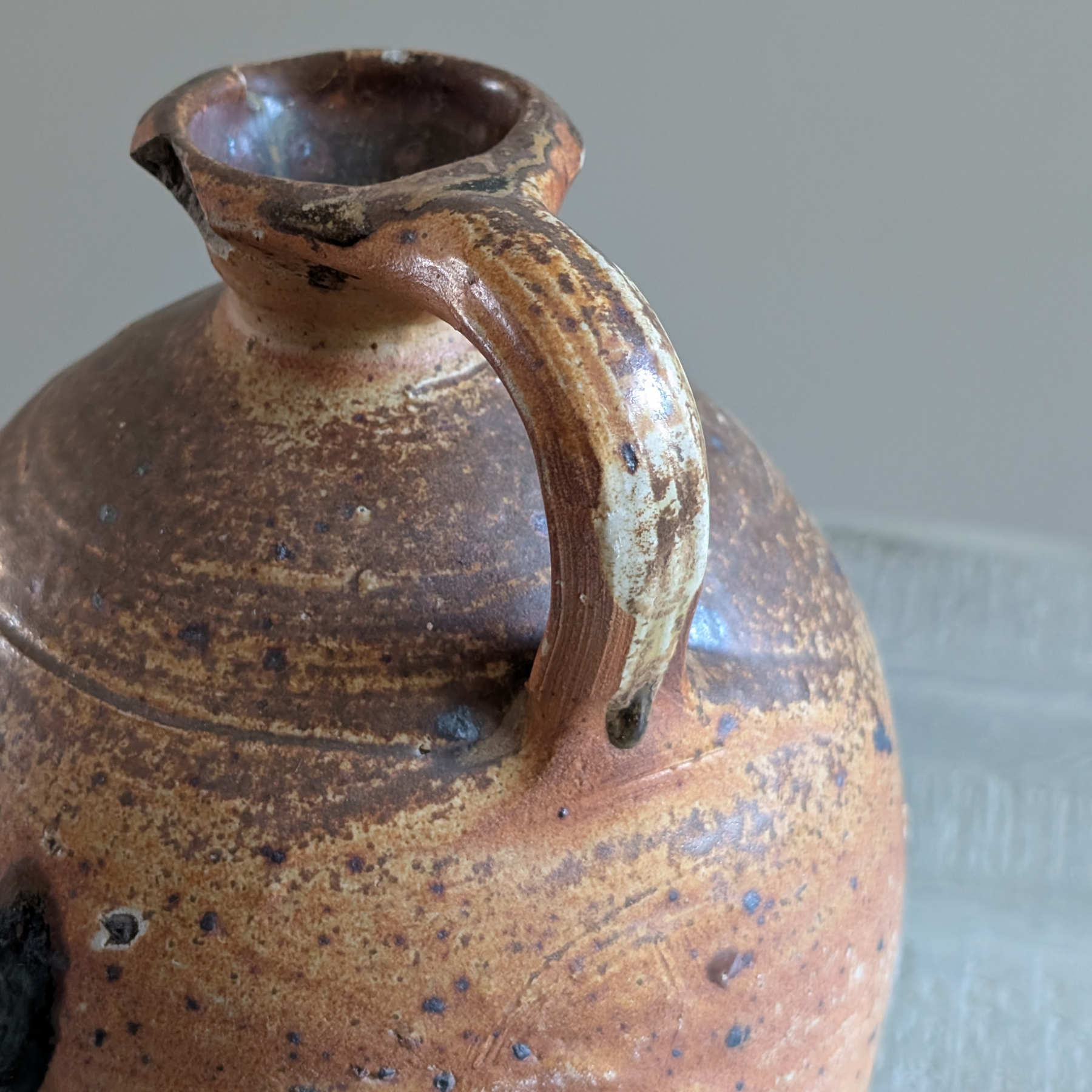 This antique jug features a charming slim neck and high handle. An earthy rust shade with various shades of warming tones throughout, this pot is ideal for kitchen styling.