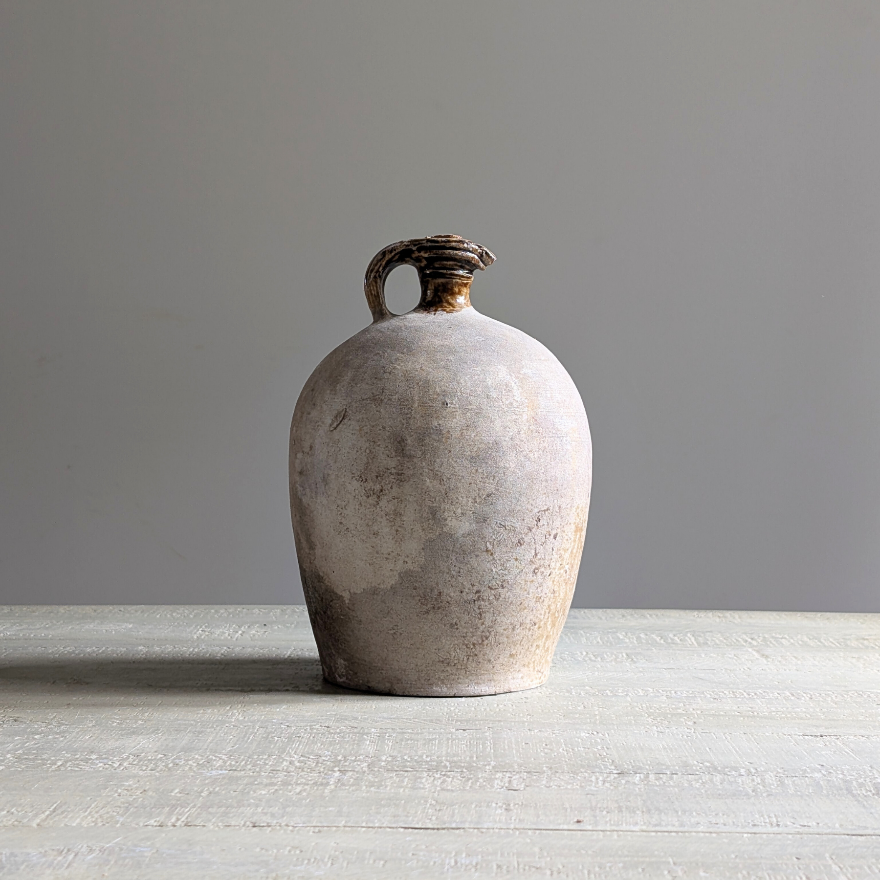 This antique jug has a characteristically slim neck and high handle. An earthy two-tone pot with a dark brown glazed top and its original cork, ideal for kitchen styling. As with all antique pieces, this piece may have slight imperfections and signs of ware, all adding to its unique character.