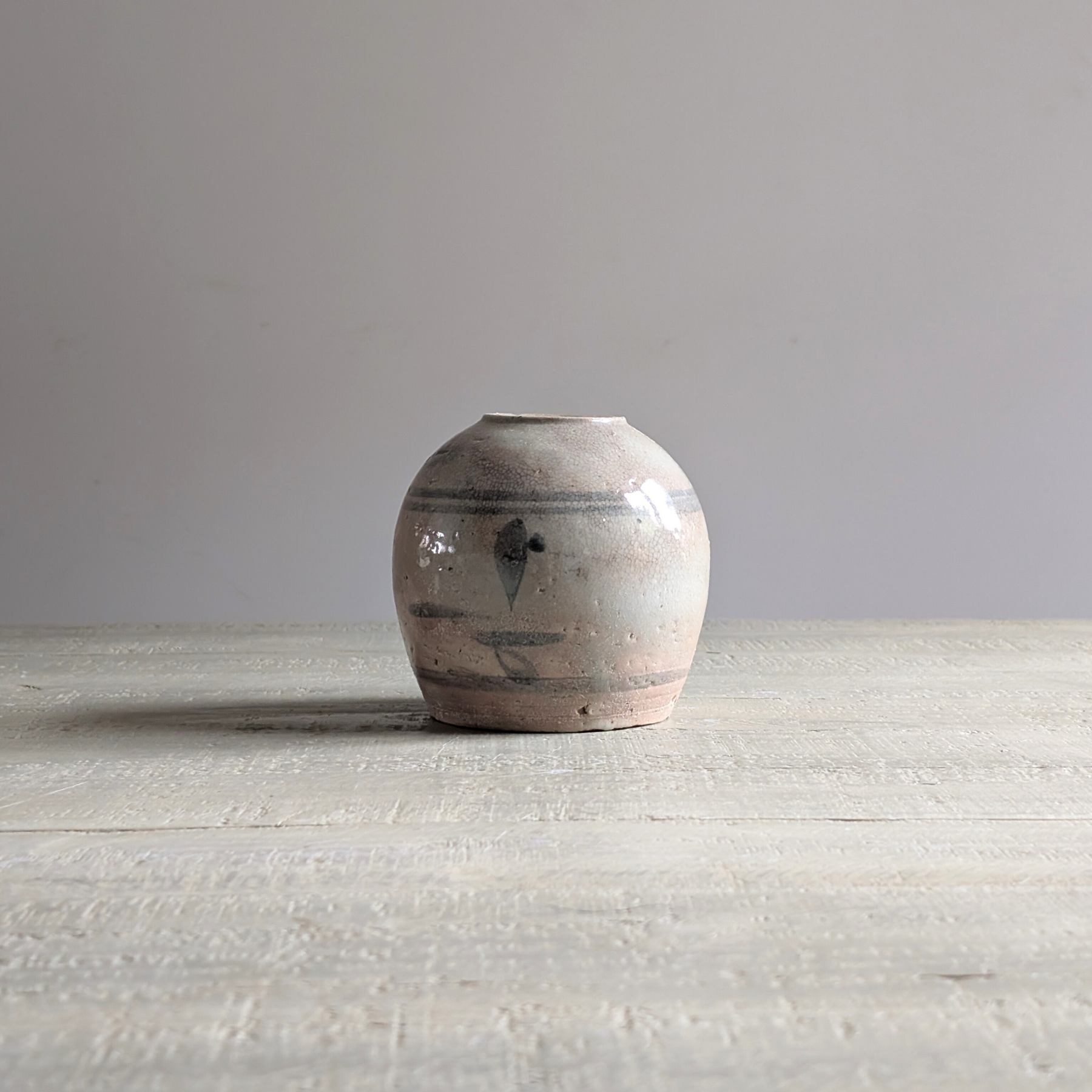 This beautiful 19th-century ginger jar has a unique blend of colours. Featuring a simple design of darker grey bands and painterly illustrations, this one-of-a-kind piece would be perfect for styling just about any shelf, cabinet, or corner.