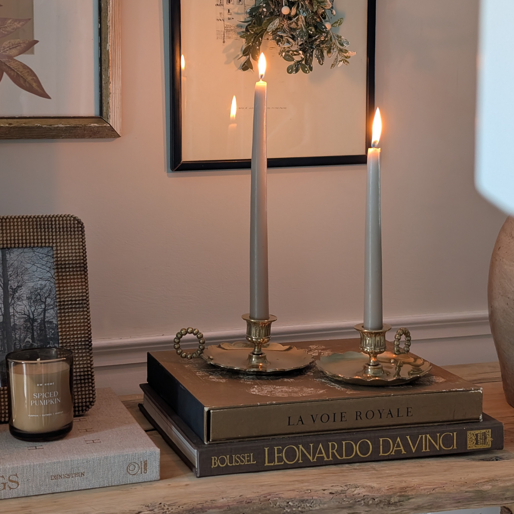 I have sourced a beautiful pair of these stunning, vintage brass candle holders, with a scalloped rim and a decorative bobbled handle. These are ideal for the cosy season! Available as a pair, or individually, style up with a classic tapered candle and display on your fireplace mantle, side table, or shelves to brighten up your space into Autumn/Winter.