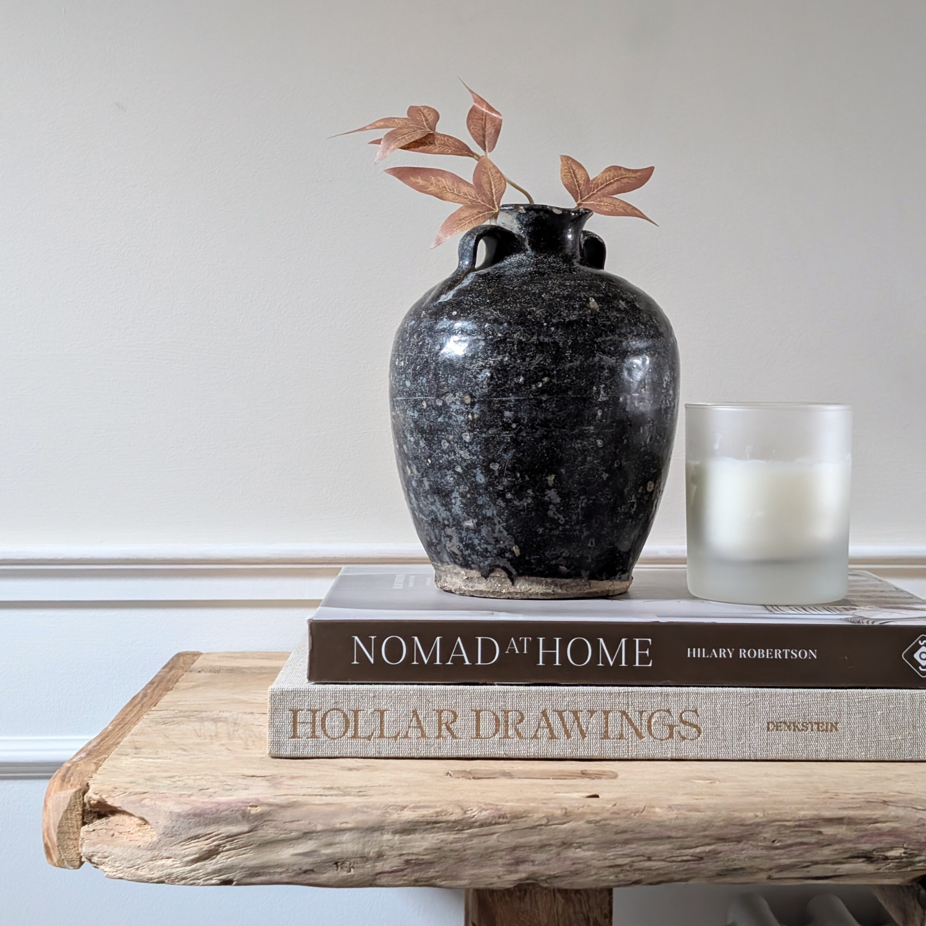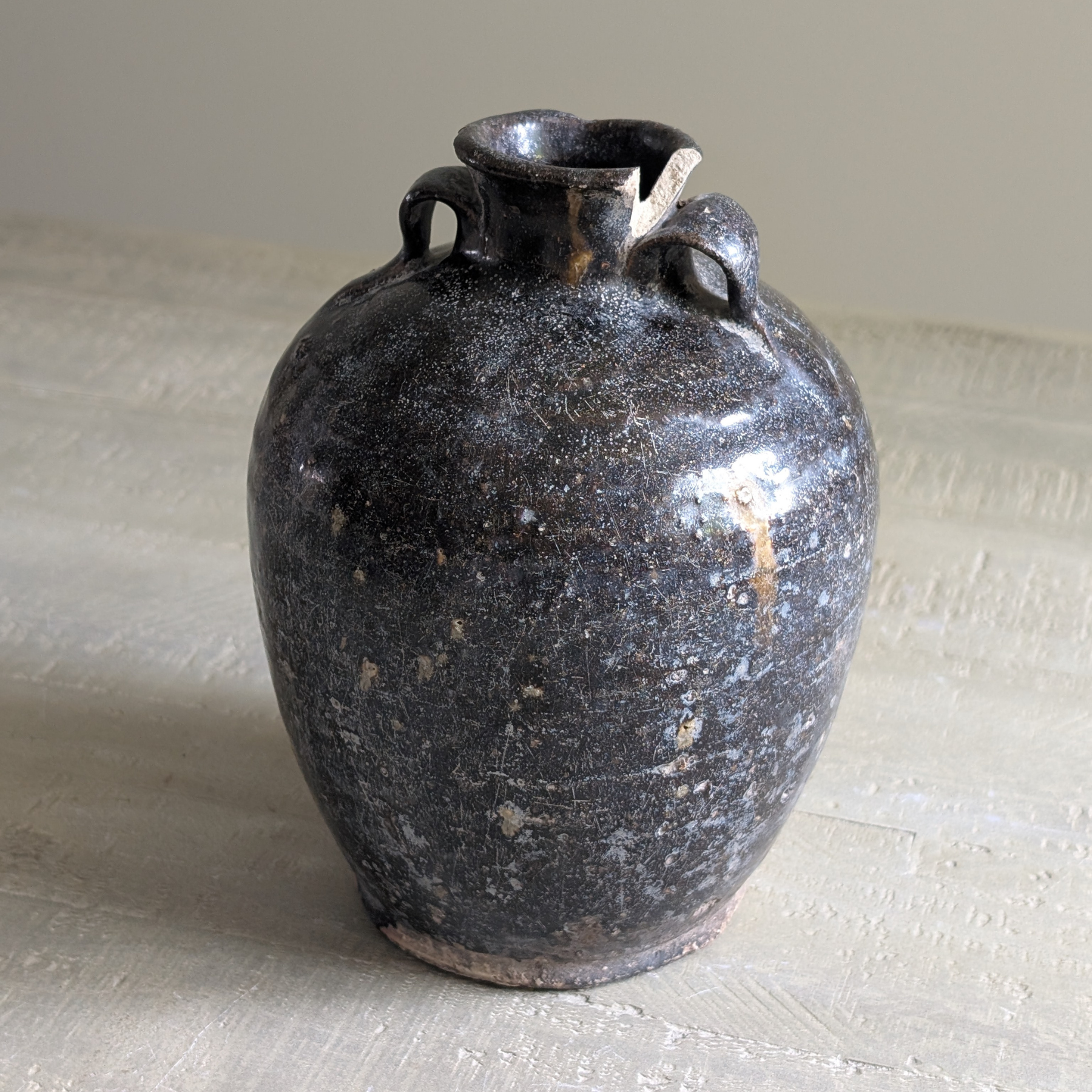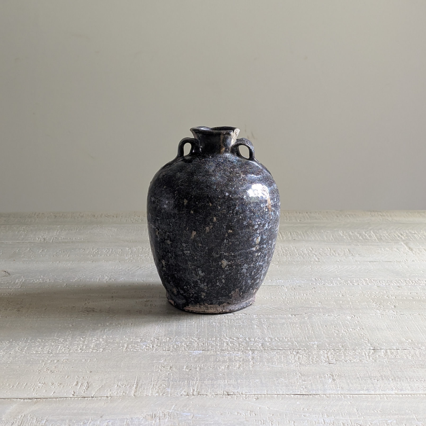 This stunning Chinese vessel is bottle-like in shape, with a gorgeous spout and two of the dinkiest ears in the world! With an unglazed earthenware bottom and a super shiny black, crazed effect to its body, this one-of-a-kind find promises to make a big impact wherever you pop him! My preference is the coffee table where he can be readily admired at all times.