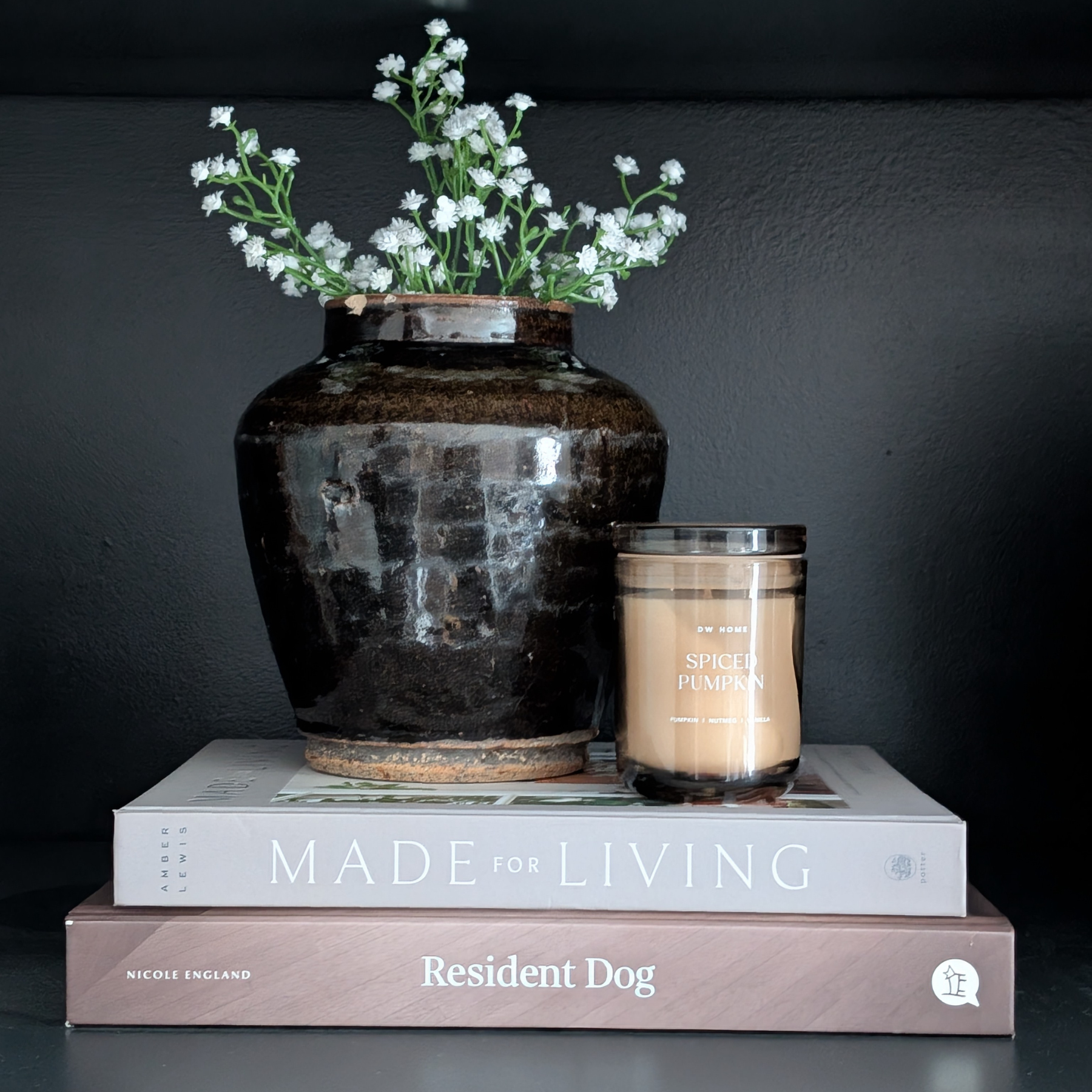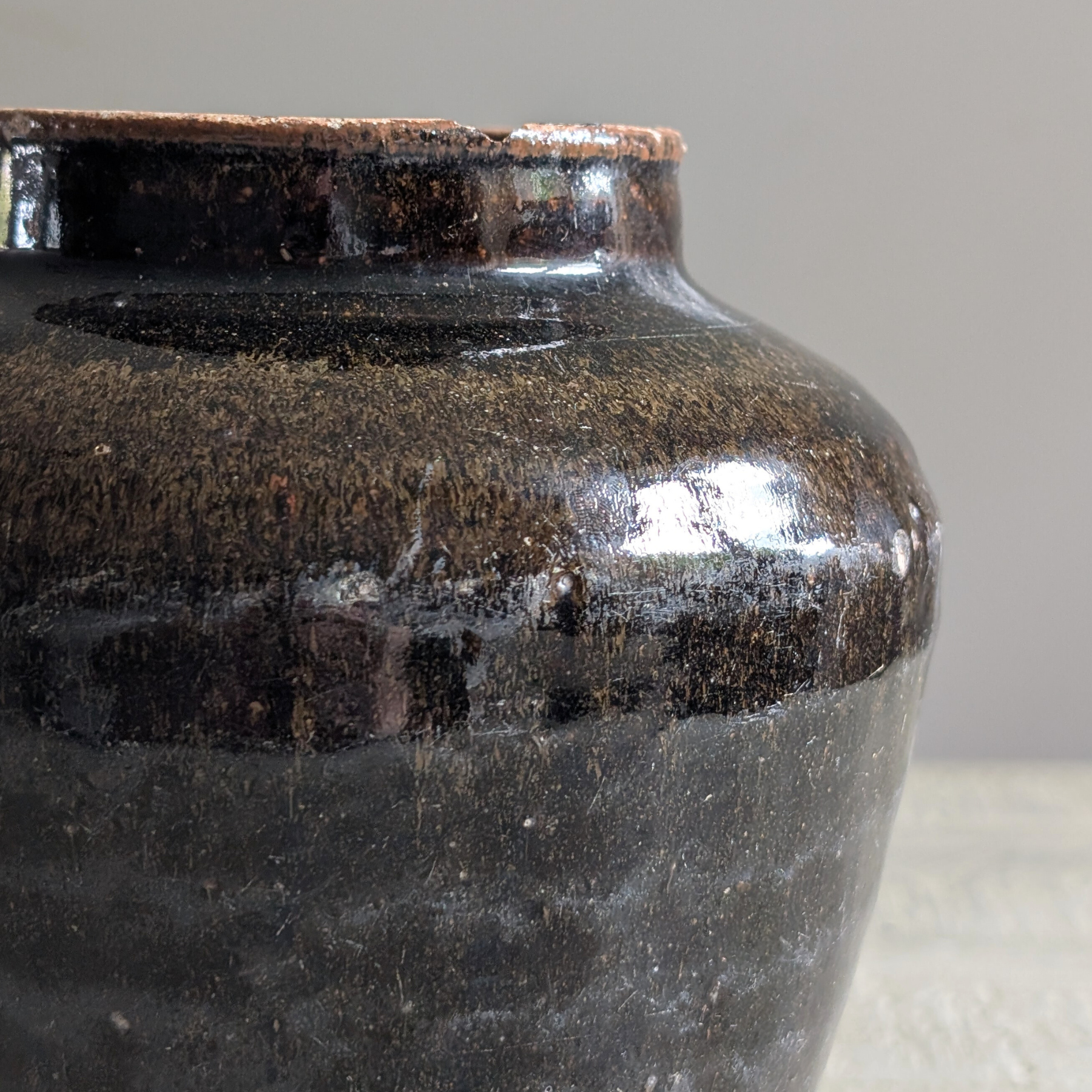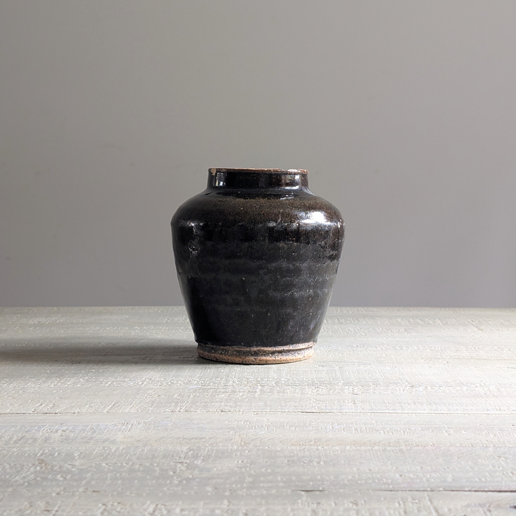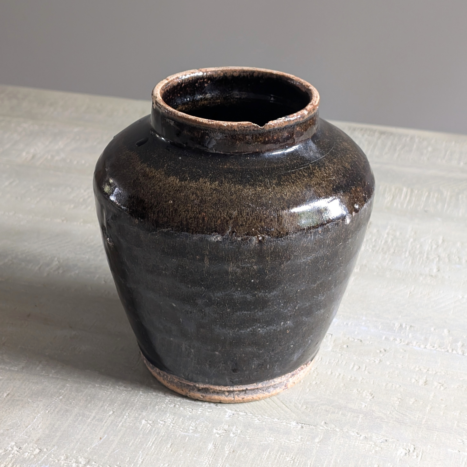 This stunning antique Chinese vessel is alllllll about depth and drama. A super shiny black glaze drips down this beautiful earthenware pot, making it ideal for displaying a contrasting floral bouquet - think gypsophillia ! Pop atop shelves, a coffee table, or a console for instant impact.