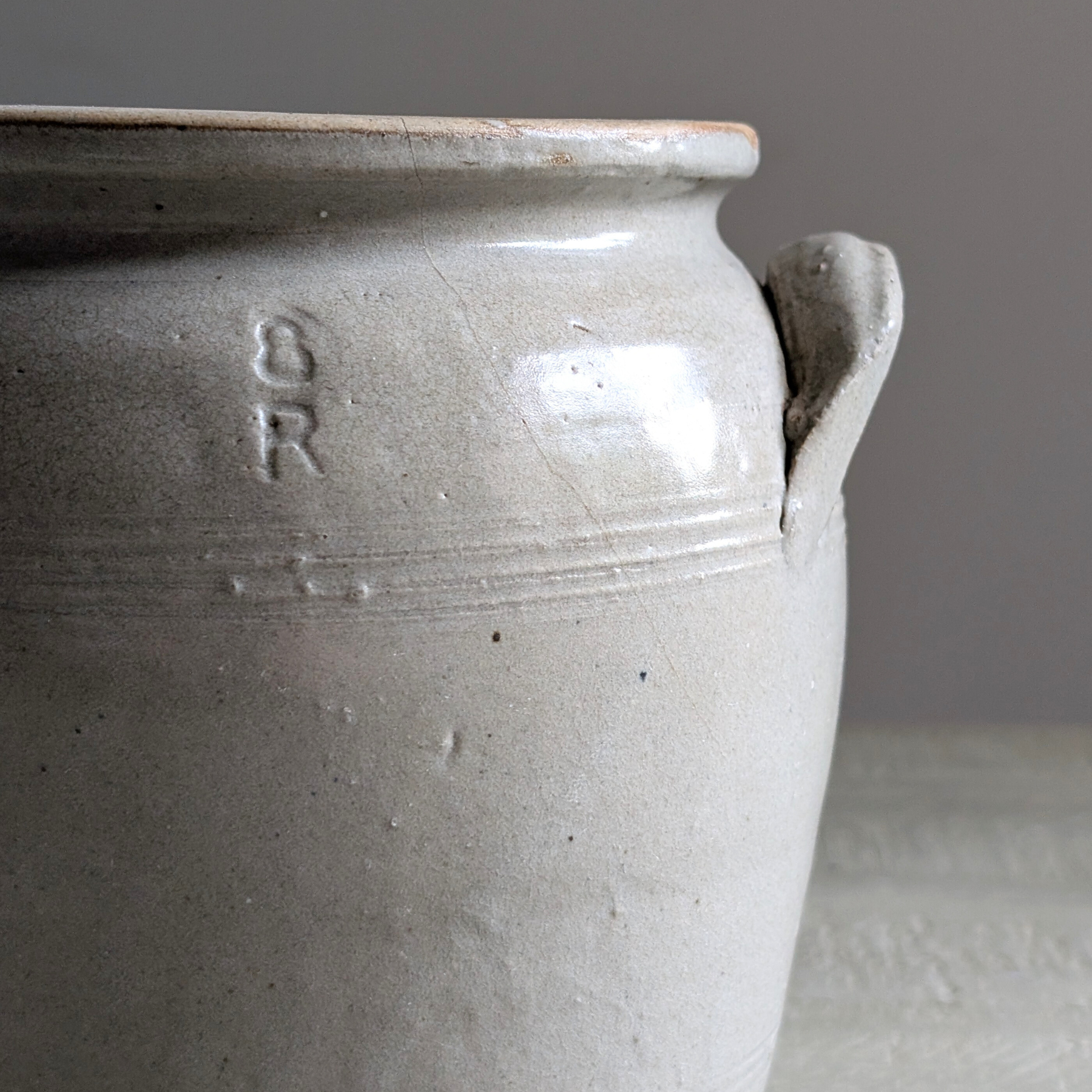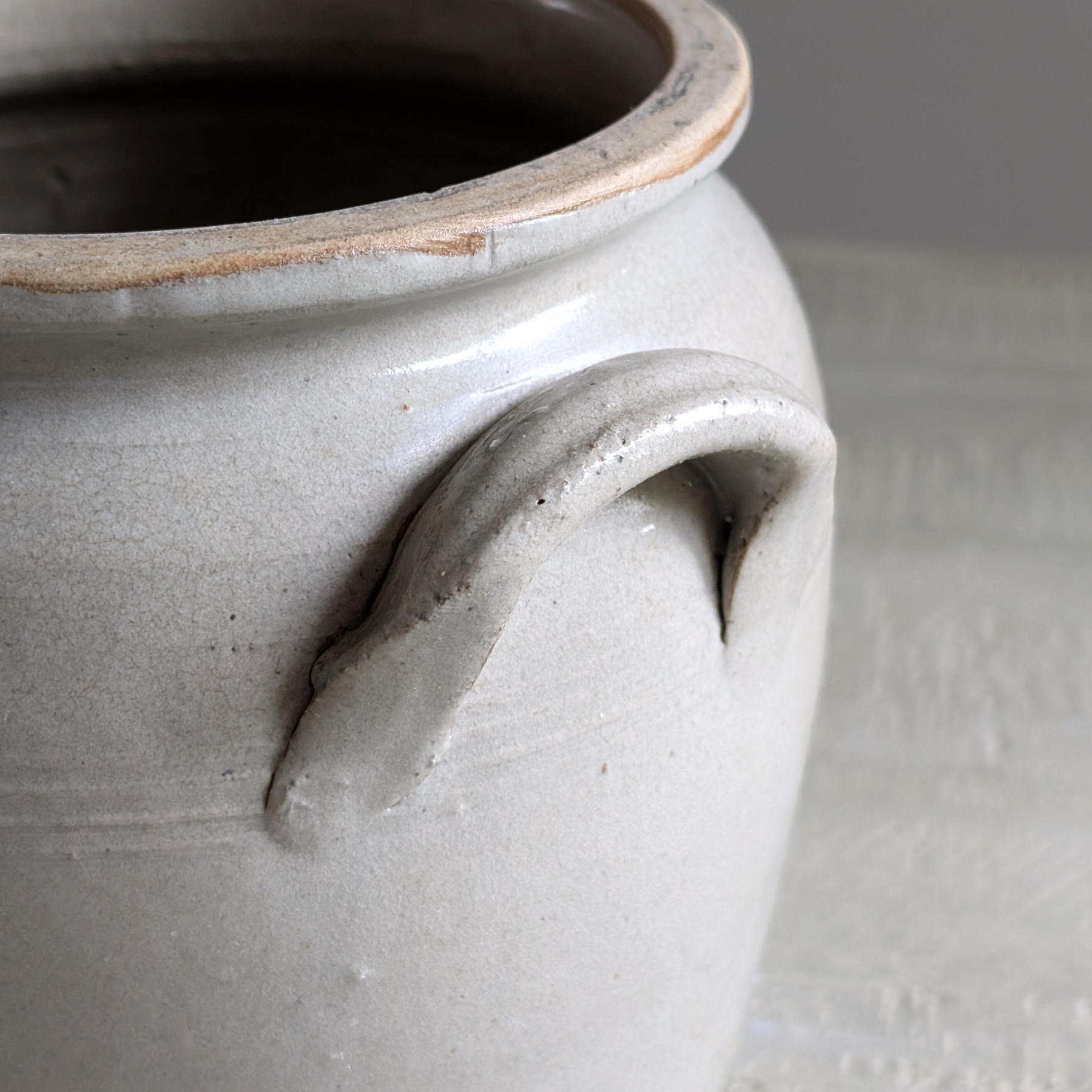 This double-handled small French confit pot is a pale grey tone. An ideal piece for housing your smaller utensils or even a floral bouquet.
