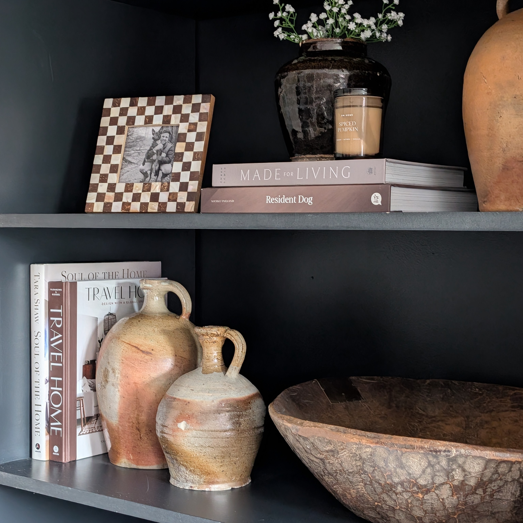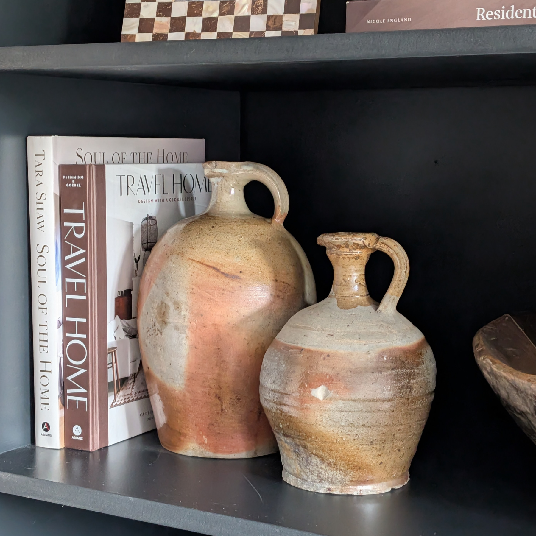 This dinky antique oil jug features a charming slim neck and high handle. A beautiful matte grey and earthy-toned body with a creamy glazed neck, this pot is a striking piece for shelf styling.