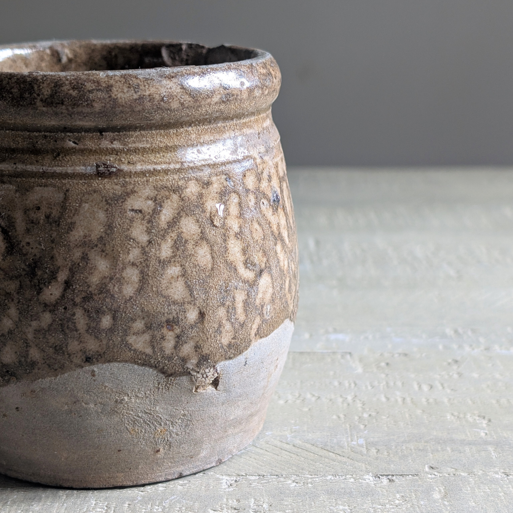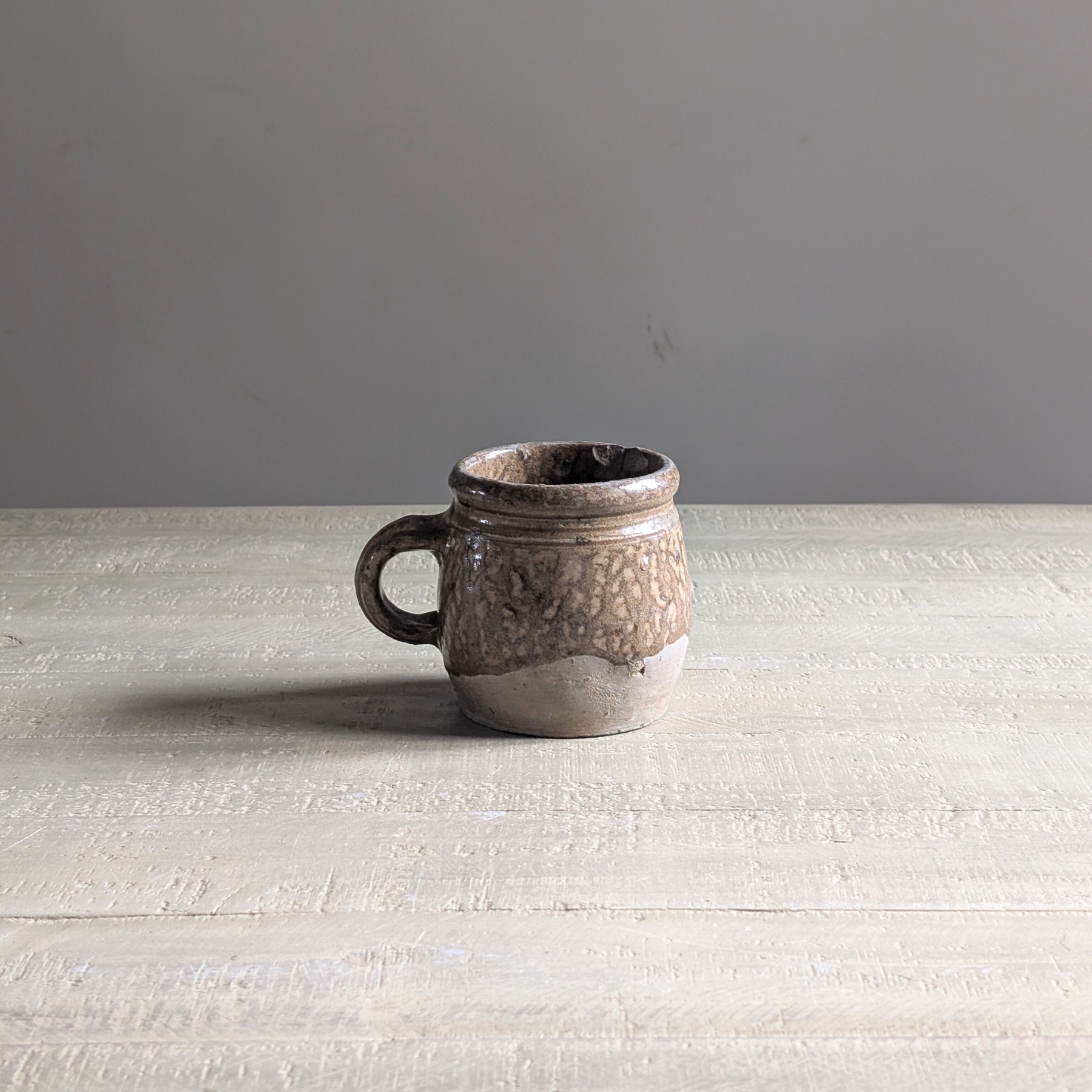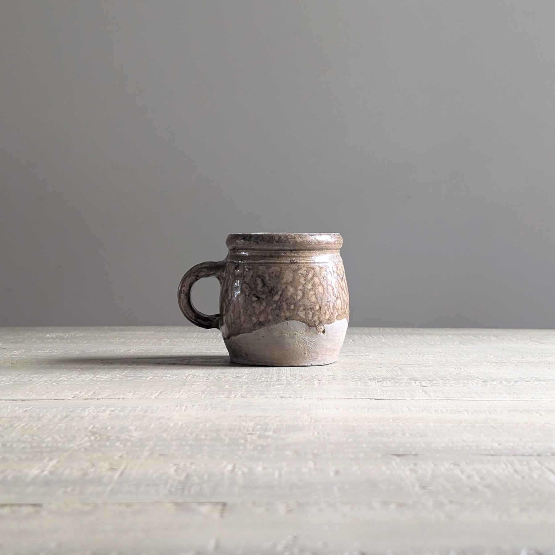 Sourced in the height of the wind, rain, and pitch black, this piece is one of those treasures that made a difficult point in our evening buying session feel so absolutely worth it! Tucked away in an unassuming box of bits, this special little jug immediately stole my heart. Glazed in a gorgeous drippy neutral, with an unglazed earthenware bottom, I hope this treasure never finds its way into the bottom of a box again! He deserves to be displayed with pride on a shelf, table, or in a display cabinet.