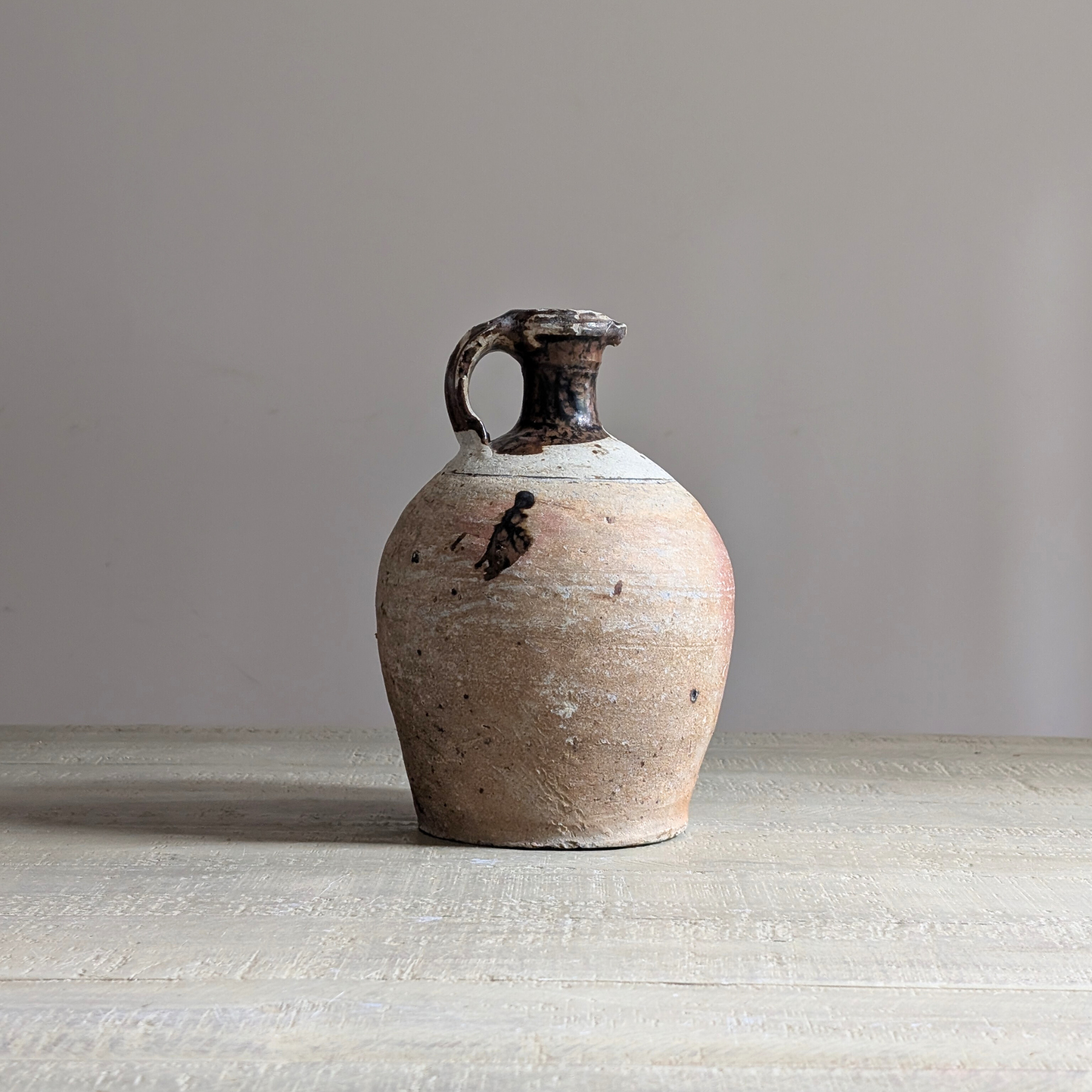 This small antique jug has a characteristically slim neck and high handle. An earthy two-tone pot with a dark brown glazed top, ideal for kitchen styling. As with all antique pieces, this piece may have slight imperfections and signs of wear, all adding to its unique character.