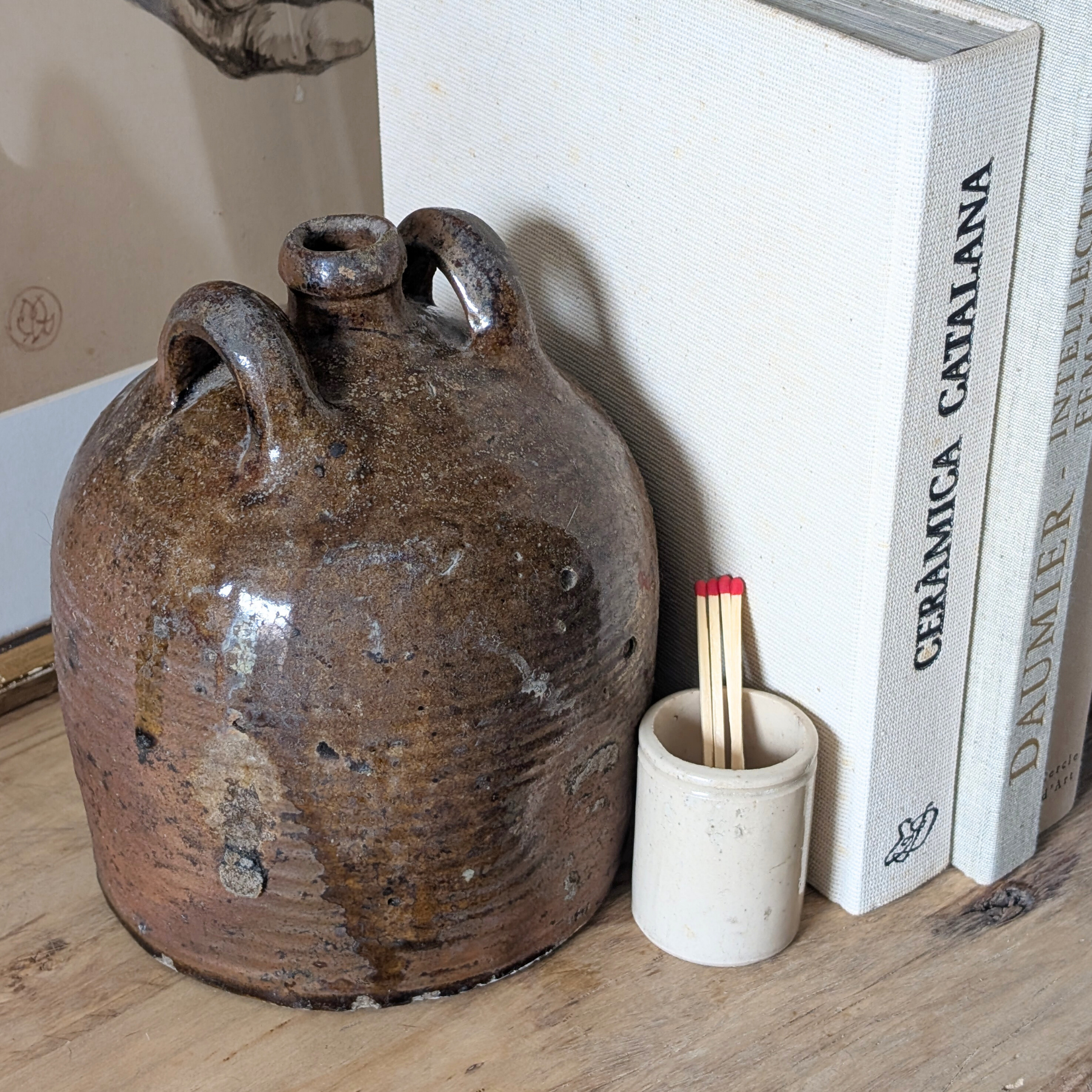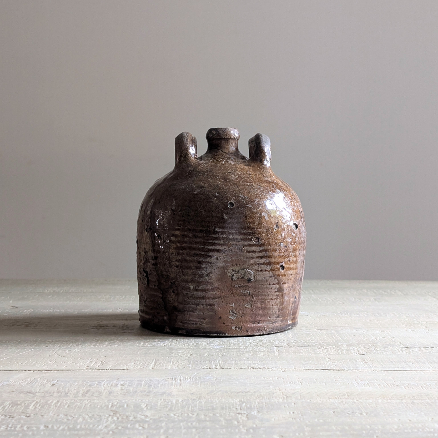 This antique oil jug features a charming spout and high handles. A warm and rich brown shade, this pot is ideal for kitchen styling.