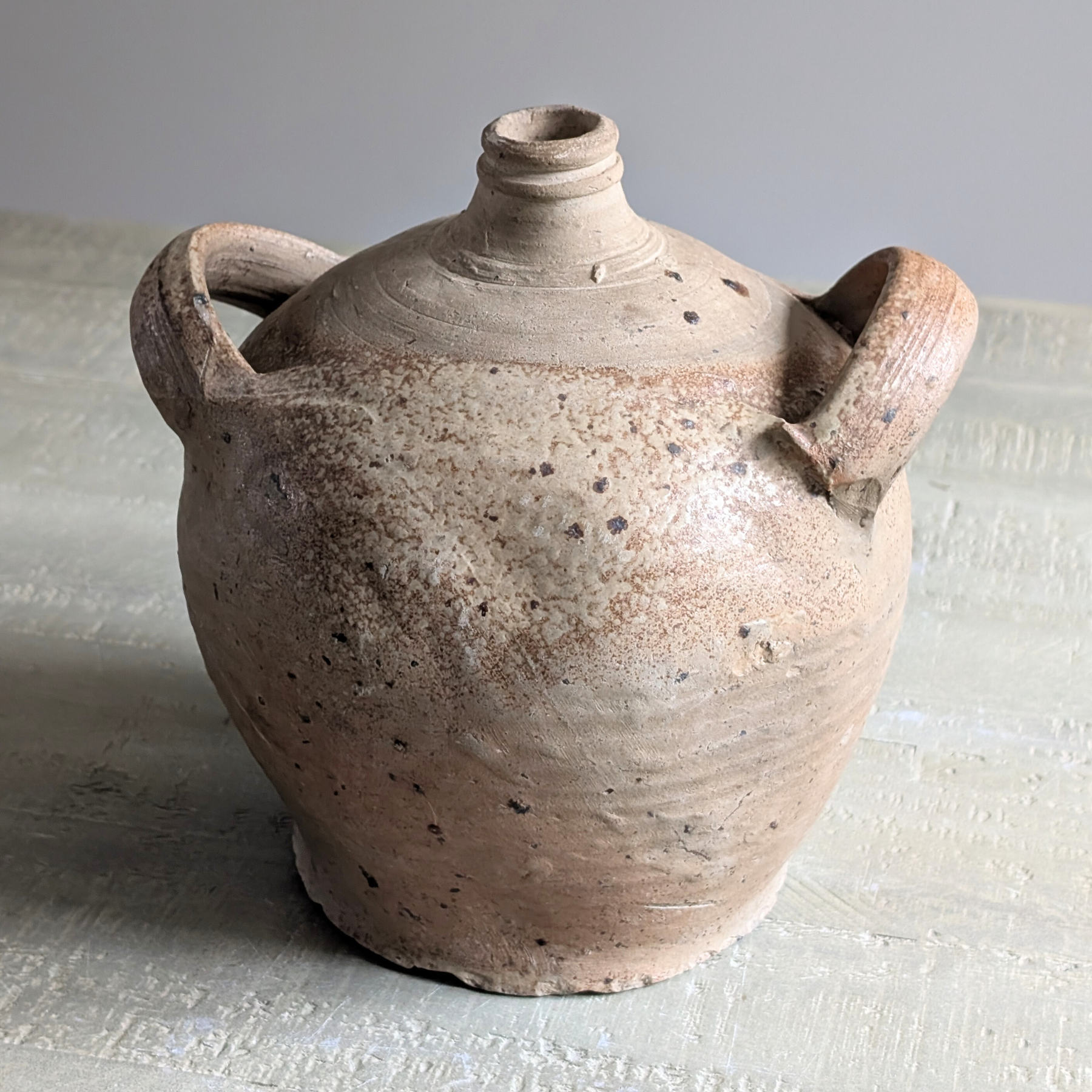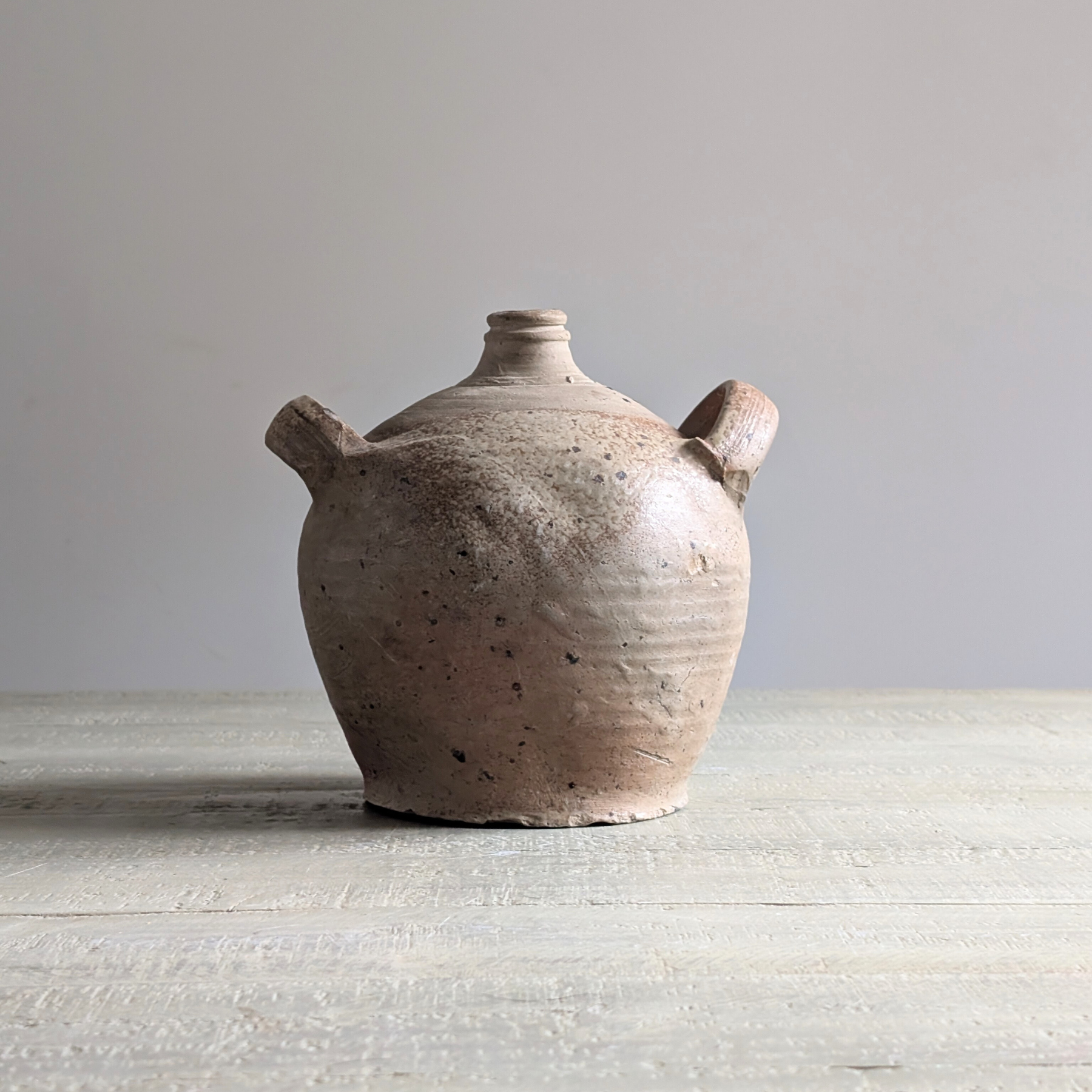 This sweet double-handled French oil jug is a usable piece that can add aged beauty to just about any corner of your home. Its small size means it can be styled up on a side table or bedside, on a kitchen shelf, or on a countertop, even if you've not got much styling room! In a rich and warming mix of neutral tones, this versatile piece would look perfect in any home.
