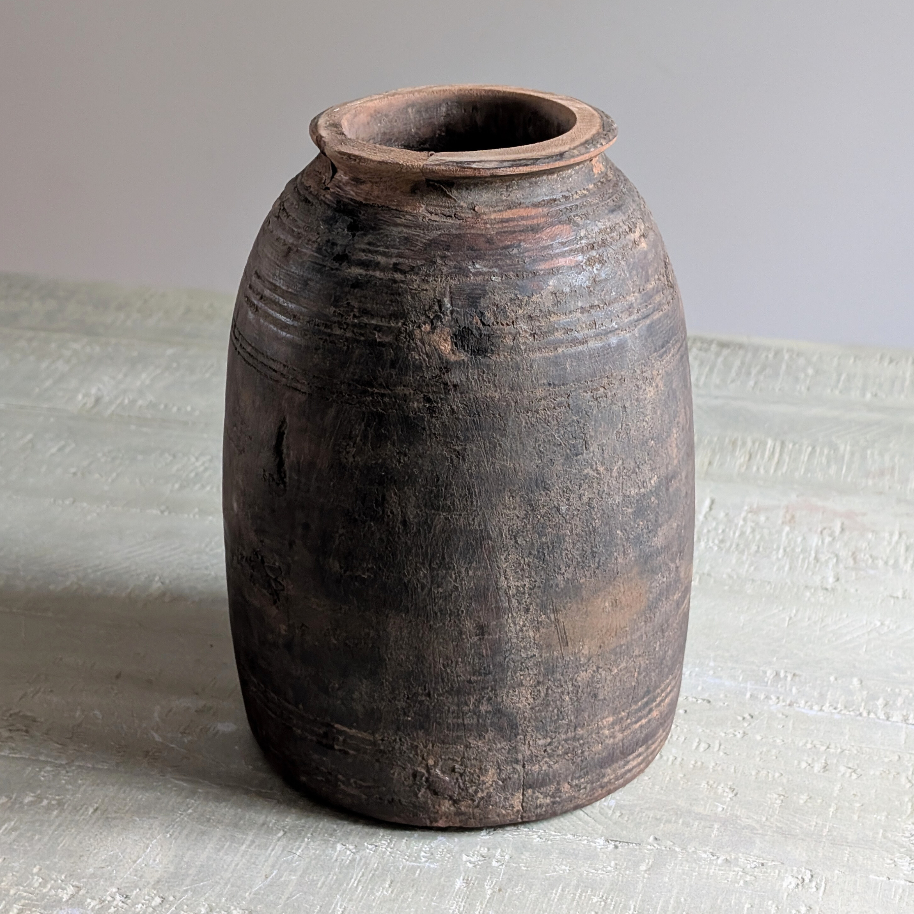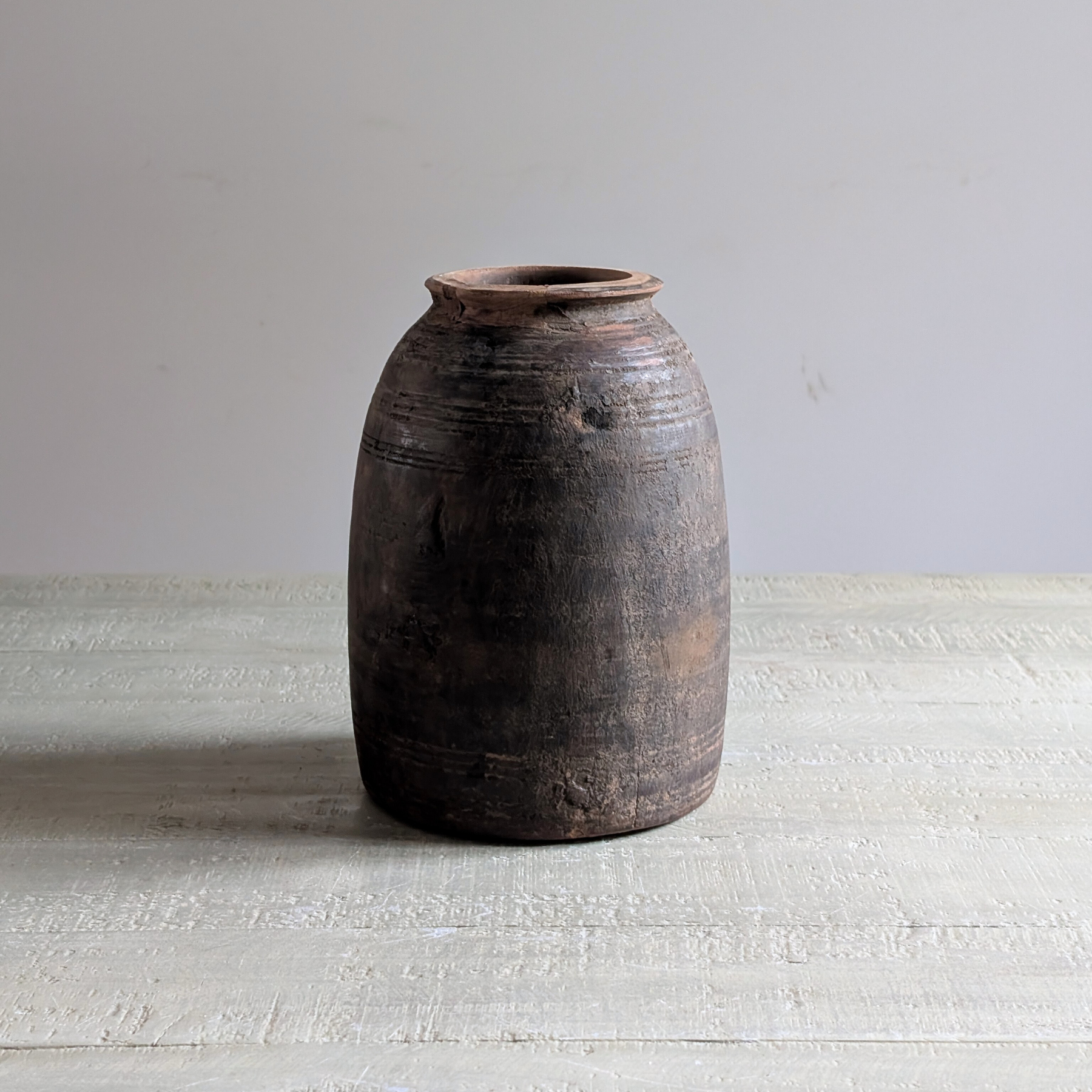 This beautiful, slim vase is hand-crafted from a solid, durable wood and carved with intricate lines for a really tactile effect. Likely originating from Tibet or Nepal, where it would've been used for curd, this rustic piece would make a beautiful display piece on shelves, either alone or with some dried or faux flowers.